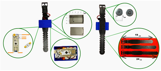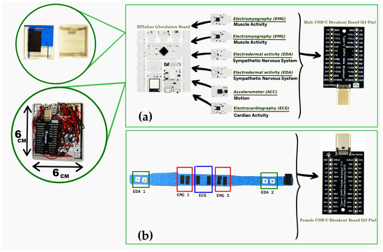 The electronic architecture of the system was built upon the BITalino (r)evolution Plugged Kit BLE/BT, which served as the main acquisition board within the abdominal belt. This board contains 10 sockets, of which six are functional for biosignal acquisition. These were allocated to two EDA channels, two EMG channels, one ECG channel, and one ACC channel, enabling synchronized multimodal monitoring [26,27]. To achieve a compact layout suitable for wearable integration, the original female sockets on the board were removed. Sensor leads were then securely soldered directly to the board, ensuring robust electrical connections and minimizing spatial constraints. An identical customization approach was applied to the wristband, which used a smaller BITalino Mini board configured for a single EDA channel acquisition. The internal electronic layout of the belt, including the BITalino (r)evolution board, custom sensors, and USB Type-C interface, is shown in Figure 3.