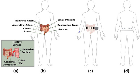 Anatomical views and sensor placement: (a) intestinal surface changes in IBS, healthy, and ulcerative conditions; (b) anterior view of small and large intestines with labeled segments; (c) body wearing the abdominal belt (ECG, sEMG) and wristband (EDA); and (d) posterior belt view showing EDA electrode placement.