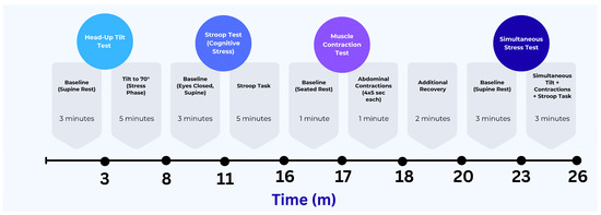 The protocol included four tasks aimed at triggering distinct physiological responses: a passive head-up tilt to activate cardiovascular autonomic regulation, a Stroop test to introduce cognitive stress, an abdominal contraction task to engage local muscle activity, and a combined task that involved both cognitive and physical challenges under orthostatic stress. Each task began after a brief baseline recording period. These conditions were chosen to test the performance of all sensing modalities, and motion under both isolated and combined physiological activations. The experimental protocol timeline and analysis epochs are depicted in Figure 6.
