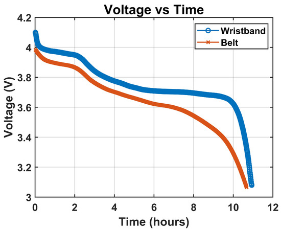 Battery voltage decay over time for belt and wristband devices under full-load operation.
