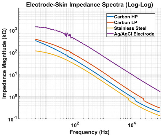 To characterize the electrical properties of the custom-fabricated electrodes and evaluate their suitability for biopotential acquisition, an impedance spectroscopy test was conducted using the Hioki IM3570 Impedance Analyzer across a frequency range of 20 Hz to 10 kHz. This method provides insight into the capacitive and resistive behavior of the electrode–skin interface, which is critical for ensuring signal fidelity, minimizing motion artifacts, and optimizing electrode material and geometry. The electrode impedance measurements were not intended for material comparison but to confirm that each electrode, as implemented in its final configuration and anatomical placement, operates within the optimal impedance range for its target signal. Prior comparative studies have established the relative performance of these materials; our goal here was to validate their suitability in the specific geometries and skin sites used in the belt and wristband designs. The selected frequency band encompasses the spectral range relevant for EDA, sEMG, and ECG, enabling a comprehensive evaluation of electrode performance for multimodal biosignal acquisition.