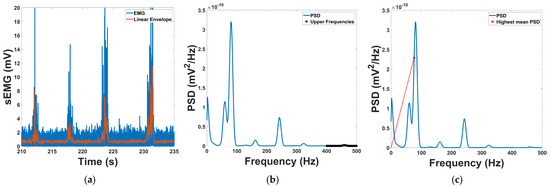 Illustrations of EMG signal quality assessment methods: (a) example of linear envelope reconstruction, with the red line showing the reconstructed envelope for a single unscaled EMG contraction; (b) SN ratio analysis, where black circles indicate high-noise frequencies used in SN ratio calculations; (c) SM ratio analysis, with the red dotted line marking the low-frequency cutoff, and power above this line identified as motion-related noise.