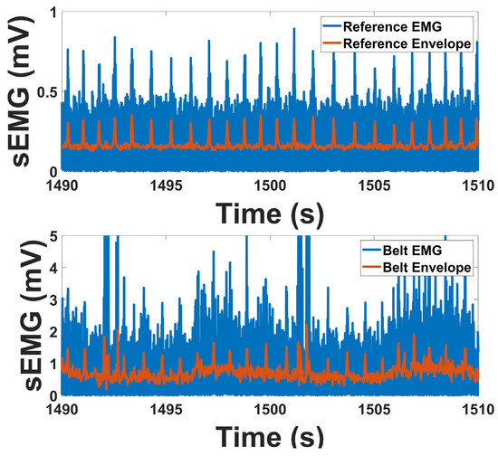 Linear envelope analysis was performed over task-specific epochs in which subjects were instructed to contract the abdominal muscles during defined test periods. The envelope was segmented according to these intervals, and the mean amplitude within each segment was computed to estimate muscle activation magnitude [41]. This approach enables consistent comparison of muscle effort across trials and subjects. The envelope provides a temporally smoothed representation of muscle activity and allows for visualization of activation patterns that align with protocol-defined tasks, such as single contractions or repeated strain efforts.