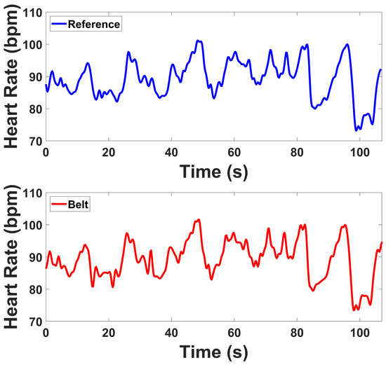 Each signal modality on the belt system was evaluated against its respective benchmark system. Quantitative indices were extracted from the recorded signals to assess waveform integrity, including metrics from both time and frequency domains. These indices were computed independently for both systems and compared to evaluate consistency in signal quality, shape, and responsiveness across different physiological states. In addition, we analyzed the robustness of each channel during tasks that naturally introduced substantial motion and postural changes, to evaluate the system’s practical reliability under real-world conditions. Statistical analyses were conducted where appropriate to compare the outputs across devices and verify the reliability of the wearable system.