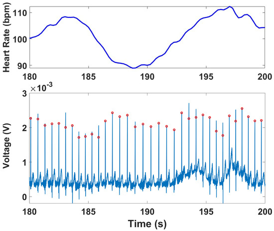 The raw ECG signal was first bandpass filtered using a 4th-order Butterworth filter with cutoff frequencies of 0.5 Hz and 50 Hz to remove baseline drift and high-frequency noise, including muscle and motion artifacts [44]. Peak detection was performed using the qrsdetect function from the BioSig MATLAB toolbox, which applies a non-linear energy operator-based QRS detection algorithm [45]. Each detected peak was visually reviewed to correct false positives or missed detections, ensuring an accurate R–R interval (RRi) series for subsequent HRV analysis. The instantaneous heart rate (HR) was computed by calculating the reciprocal of the time interval between successive R-peaks. This HR series was interpolated using cubic spline interpolation and resampled at 4 Hz to produce a continuous HR waveform suitable for both time-domain and frequency-domain analyses [46].