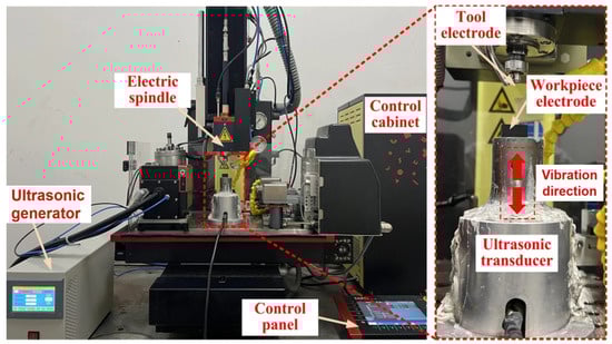 The main components of the system were the control cabinet, control panel, electric spindle, ultrasonic generator, ultrasonic transducer, and tool electrode. The control cabinet was responsible for the powering of the equipment, whereas the control panel allowed for positioning of the electric spindle to the desired machining location and execution of machining programs. The ultrasonic system, provided by Hangzhou Chenggong Ultrasound Company (Hangzhou, China), had a power of 1500 W and a frequency of 20 kHz. The ultrasonic generator offered an amplitude setting for the transducer. As shown by the red dashed outline in Figure 1, the ultrasonic transducer was placed directly above the workpiece during machining, and its vibration direction was parallel to the axial direction of the tool electrode. During processing, the periodic axial vibration of the transducer caused both cavitation and pumping effects in the working fluid, which improved debris removal and improved the overall machining performance.