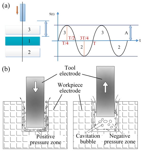 Figure 3a is a schematic of the ultrasonic vibration model, where the tool electrode vibrates at high frequency with a period T under ultrasonic excitation. S(T) represents the displacement of the electrode with time during ultrasonic vibration. The electrode motion is periodic: downward motion is taken as positive and upward motion as negative. The maximum and minimum values of S(T) are the extreme positions of the electrode in the positive and negative directions, respectively, with respect to its initial position. At T/2 and T, the instantaneous displacement S(T) goes back to zero. This model shows the dynamic motion behavior of the electrode under ultrasonic vibration. These oscillations cause cavitation and pumping effects in the discharge gap, as shown in Figure 3b. As the electrode vibrates, it produces high-frequency elastic waves in the working fluid. When the local pressure falls below the saturated vapor pressure of the fluid, transient negative-pressure regions form, which results in the formation of microscopic cavitation bubbles. Upon collapse, these bubbles release instantaneous impact forces that increase jet velocity within the discharge channel, effectively detaching debris from the bottom of the machined hole. This mechanism ensures the debris is not accumulated, and thus both the machining quality and efficiency are improved. The pumping effect is achieved by the high-frequency reciprocating motion of the electrode, which compresses and releases the working fluid in the discharge gap alternately. When the electrode is moved away from the workpiece, the volume of the gap is increased, creating a localized low-pressure area which draws fresh working fluid quickly into the gap. Conversely, as the electrode gets closer to the workpiece, the volume of the gap reduces and creates a localized high-pressure zone, which forces debris-laden fluid outward. This process is efficient in terms of erosion debris removal and its accumulation prevention, ensuring uninterrupted fluid renewal and restoring the insulating strength of the dielectric. As a result, abnormal discharges are minimized, the machining process is stabilized, and the occurrence of low-resistance conduction states in which the current flows at low voltage and high current, causing the energy dispersion without effective erosion, is effectively suppressed.