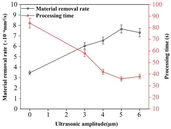 Effect of ultrasonic amplitude on MRR and processing time.