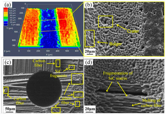 Figure 5 shows the CLSM and SEM images of the surface of the C/SiC composite after EDM. Figure 5a presents the 3D morphology of the micro-hole created via EDM, where the blue region represents the machined area. The uneven color depth shows great height variations, and local pits and protrusions may be present. Figure 5b shows the SEM morphology of the micro-hole, and the cross-sections of carbon fibers and SiC matrix between them can be clearly seen. These features are in agreement with the 3D morphology, both revealing pits and protrusions. The observed morphology proves that during EDM of C/SiC composites, the removal of the SiC matrix leaves protruding carbon fibers, indicating that the erosion rate and volume of the SiC matrix are higher than the carbon fibers.