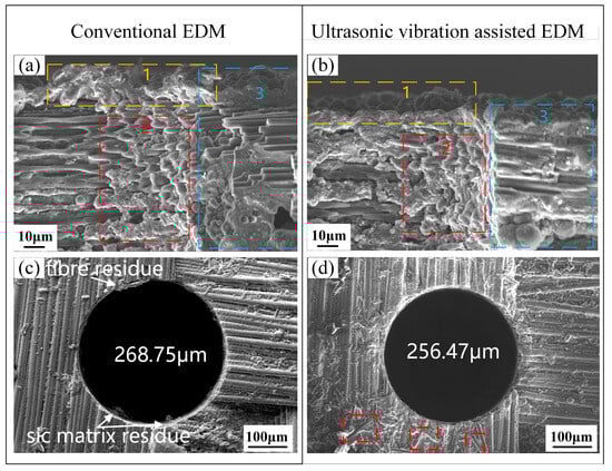 Comparison of the recast layer and hole diameter of C/SiC composites processed using conventional EDM and ultrasonic vibration-assisted EDM. (a) Recast layer after conventional EDM. (b) Recast layer after ultrasound-assisted EDM with an amplitude of 5 μm. (c) Hole diameter after conventional EDM. (d) Hole diameter after ultrasonic vibration-assisted EDM with an amplitude of 5 μm.