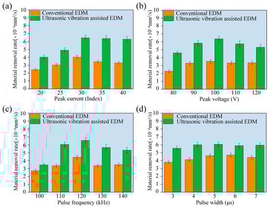 Effect of electrical parameters on MRR in conventional EDM and ultrasonic vibration-assisted EDM. (a) Peak current; (b) peak voltage; (c) pulse frequency; (d) pulse width.