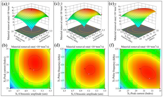 Response surface and contour plots of ultrasonic amplitude, peak current, and pulse frequency on MRR. (a) Response surface plot of ultrasonic amplitude and peak current. (b) Contour plot of ultrasonic amplitude and peak current. (c) Response surface plot of ultrasonic amplitude and pulse frequency. (d) Contour plot of ultrasonic amplitude and pulse frequency. (e) Response surface plot of peak current and pulse frequency. (f) Contour plot of peak current and pulse frequency.