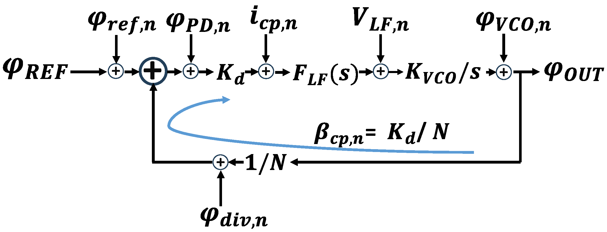 By ignoring the flicker noise, we focus on the fundamental limitations due to thermal noise. Define the loop gain β CP as K d / N , then we can write the transfer function (where G ( s ) is the open-loop transfer function) as follows:
