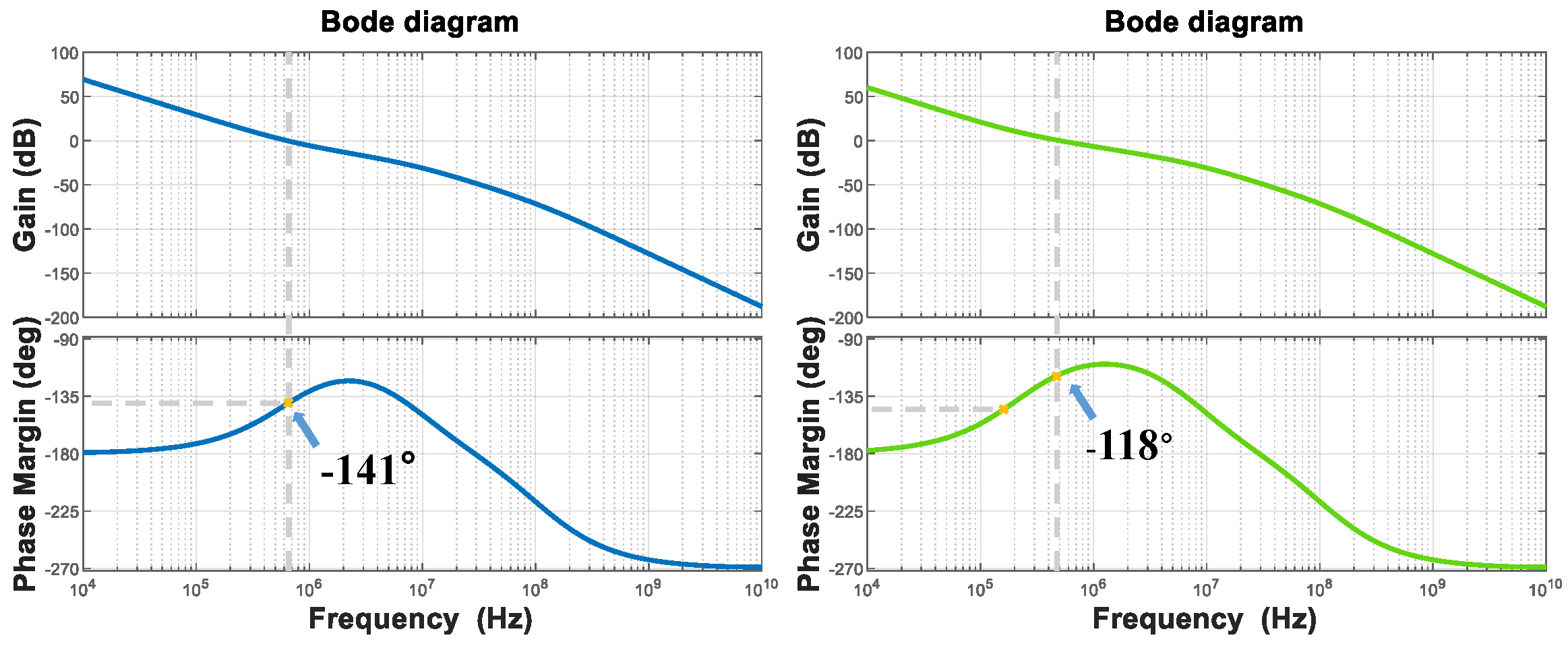 Through modeling and verification in MATLAB, it can be intuitively observed from the Bode plots that the capacitance multiplication effect improves the phase margin. The comparison is shown in Figure 6.