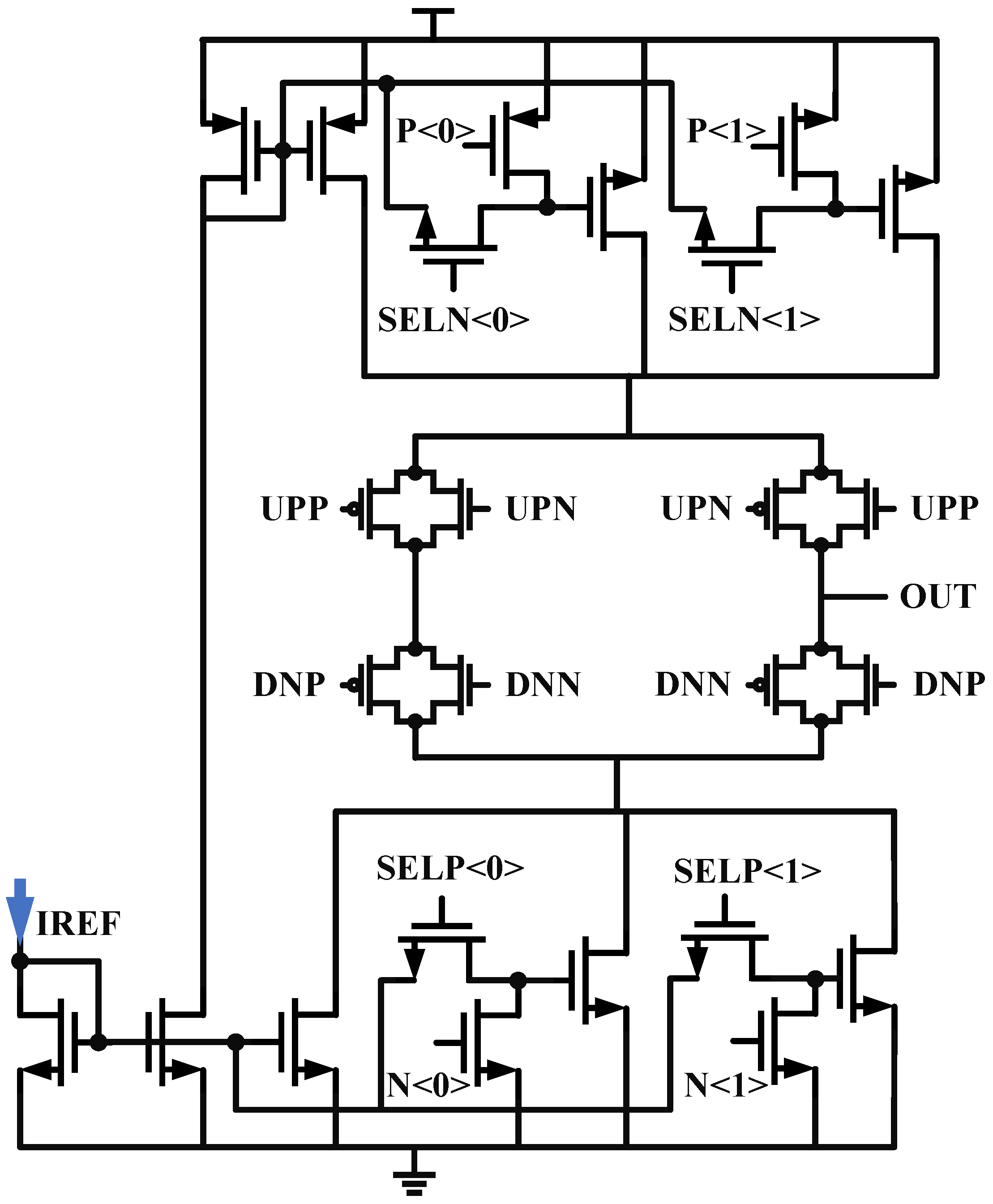 By coordinating the two charge pumps, where CP1 charges and CP2 discharges, the first-level capacitor of the loop filter is doubled, becoming I C P 1 I C P 1 I C P 2 . The pathway is labeled in Figure 5. The necessity of doubling and the issue of loop stability have been discussed in the previous text. To facilitate the adaptation of system lock time, CP1’s current is configured with a step size of 30 μA from 30 μA to 120 μA, and CP2’s current is configured with a step size of 20 μA from 20 μA to 80 μA. CP1 and CP2 share the same architecture, as shown in Figure 7, with a little difference in current configuration. To reduce leakage current, long-channel transistors are selected [20].
