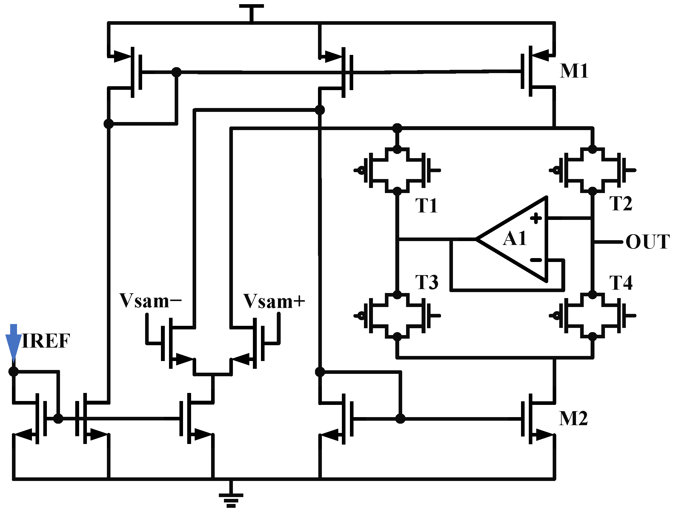For the classic charge pump structure, we first need to address the charge sharing issue: if M1 and M2 are only coupled to the output through ordinary switches, when the switches are turned off, their drain ends will be charged and discharged. When the switches are closed again, charge redistribution occurs between the capacitors. To suppress this non-ideal effect, this paper adds two switches, T1/T3, and a unity gain amplifier between the nodes where charge sharing occurs, proposing a new sub-sampling charge pump structure. The schematic is shown in Figure 8. When T2/T4 are turned off, T1/T3 are closed, and the clamping action of the op-amp makes the drain voltages of M1 and M2 the same as the output node voltage. When T2/T4 are turned on again, there is no potential difference, so the parasitic capacitance does not participate in the charge redistribution.