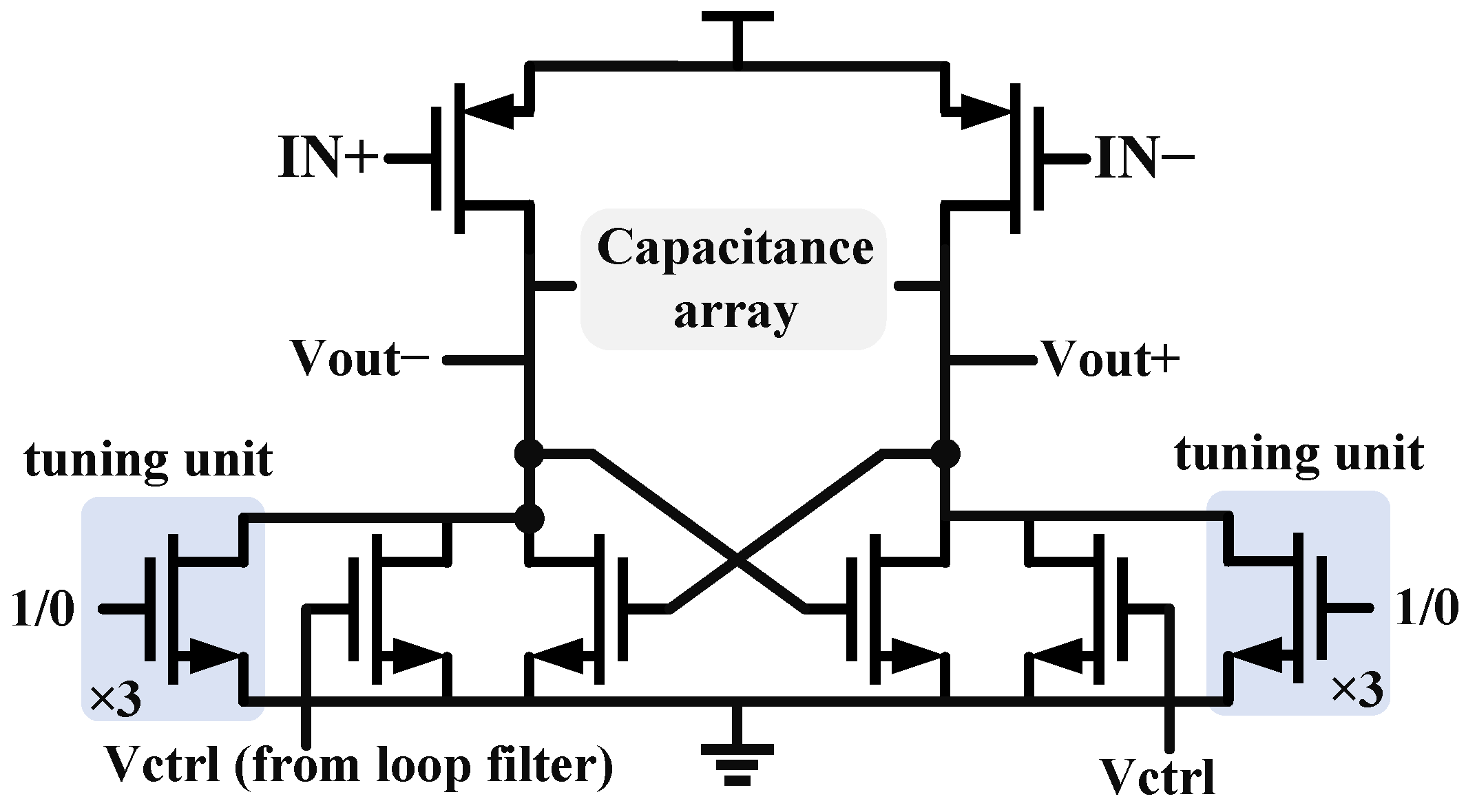 The structure of voltage-controlled oscillators can generally be divided into two types: Capacitor–Inductor oscillators (LC VCO) and ring oscillators (ring VCO). The LC type VCO has low output phase noise but requires a larger layout area. Therefore, considering the application background of a small area for image sensors, a three-stage ring oscillator structure is chosen for this design. Figure 11 shows the unit structure. The classic variable resistor delay cell and three pairs of controllable tuning switches have been added in parallel on the original basis to cope with a wider range of output frequencies. And the controllable capacitor array can further refine the tuning range and fill the gaps between tuning steps. Cross-coupled NMOS topology structure can provide a larger margin of variation and low parasitic capacitance [21].