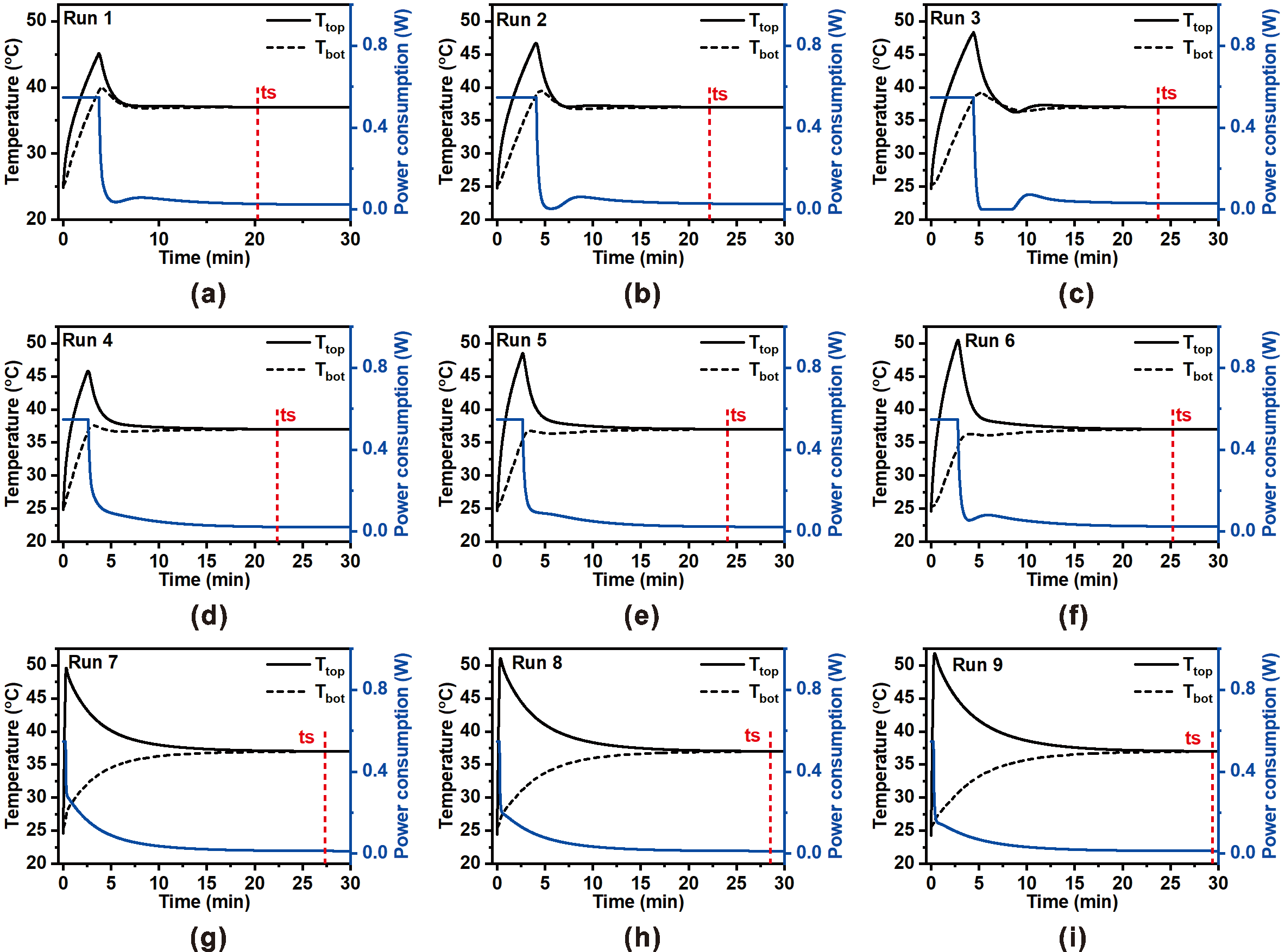 8]. Across all cases, the heater initiates with a high power demand during the early transient period to rapidly suppress heat flux between the skin and environment. This is accompanied by a sharp rise in T