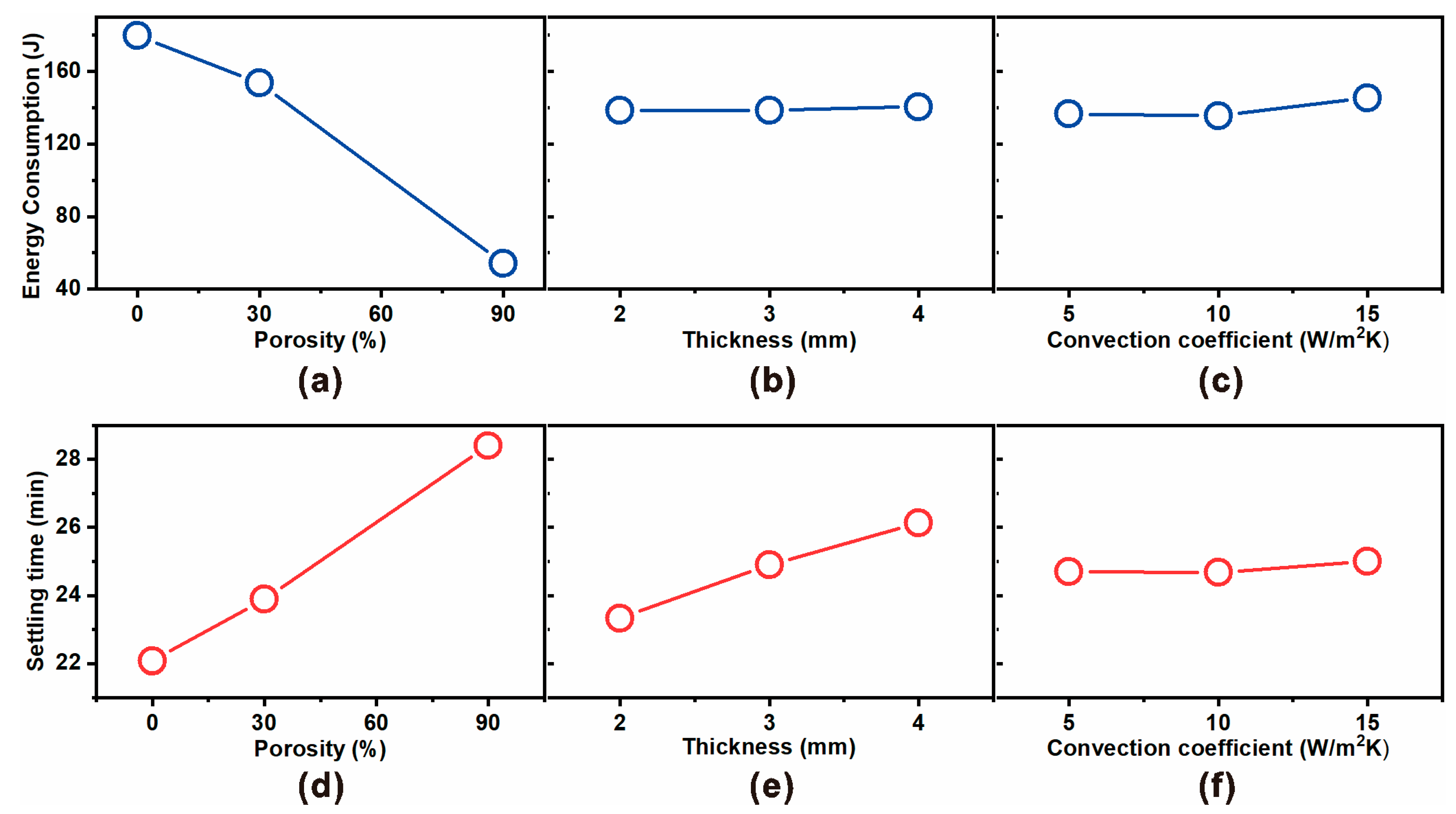 Taken together, the ANOVA results highlight a fundamental design trade-off: (1) Increasing porosity reduces steady-state power consumption, enhancing energy efficiency; (2) However, the same porosity increase prolongs settling time, limiting transient responsiveness; (3) Insulation thickness provides an additional lever for tuning response dynamics but at the cost of slower equilibration when increased.