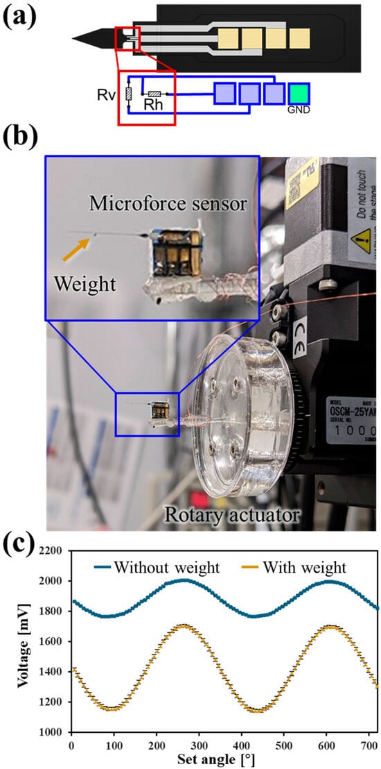 We previously reported a manual method for evaluating the microforce sensors []. In this method, sensors were mounted on a manual rotary manipulator, and their A/D output values were captured every 36° during rotation. However, this manual procedure had several limitations, including difficulties in precisely controlling the rotation angle and insufficient data density (10 points per rotation), both of which can compromise the calibration accuracy. To address these issues, we automated the calibration process by incorporating a motorized rotary stage. This enhancement allowed for finer angular sampling; specifically, we increased data acquisition from 10 to 50 angular positions per full rotation.