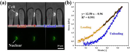 (a) Example of indentation testing of cells performed with the microhand. (b) Example of strain–stress curve during indentation test (orange: loading (going up), blue: unloading (going down) process). The elastic modulus was calculated from high-strain region.