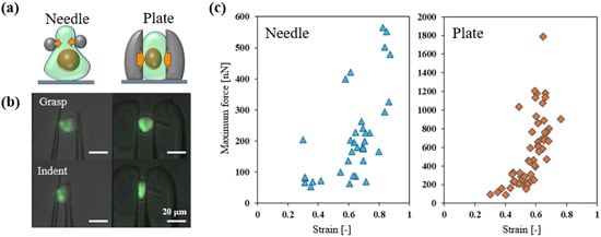 (a) The schematic diagram and (b) actual image of the cell compression using needle (left) and plate (right) end-effectors (green: nucleus). (c) The maximum force applied to the HEK293A cells by the needle-shaped (n = 30) and plate-shaped (n = 57) end-effectors were plotted.