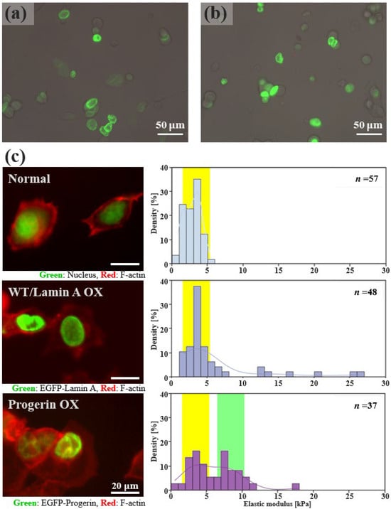 Next, we examined the elastic moduli of the cells using a microhand system. Both Progerin OX and Lamin A OX cells exhibited a broader distribution of elastic moduli than normal cells (Figure 6c: right). The histograms revealed that all the samples had a prominent peak at 2–4 kPa, suggesting that this stiffness range primarily reflected the contribution of the endogenous cytoskeleton. Progerin OX also exhibited a peak at 6–8 kPa. The histogram of Lamin A OX showed a right-skewed distribution, suggesting a significant contribution of lamin A protein to whole-cell stiffness. We hypothesized that Lamin A OX increased cell stiffness by strengthening the existing wild-type lamin meshwork []. In contrast, progerin does not form lamina network. Instead, it accumulates on the nuclear envelope, resulting in an altered stiffness distribution. Our findings are consistent with those of previous micropipette aspiration studies reporting that the stiffness of the nucleus of a normal HeLa cell is ~4 kPa, whereas that of a progerin-expressing cell is ~9 kPa []. Therefore, we interpreted the lower peak (2–4 kPa) observed in Progerin OX cells as the contribution of native lamin A whereas the higher peak (6–8 kPa) reflected the progerin accumulation. This implies that, when progerin expression exceeds a certain threshold, its stiffening effect on the nuclear membrane dominates that on the endogenous network.