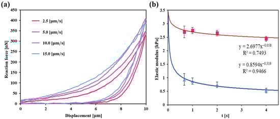 (a) Force–displacement curve at different indentation speed. (b) Comparison of elastic modulus fitted with the power-law model. The red data shows high-compression conditions (nucleus) and the blue data shows low-compression. Error bars represent standard error (n ≥ 16).