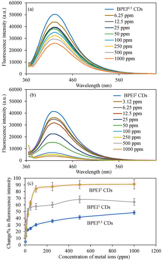 Furthermore, Figure 5c presents the fluorescence values of BPEI2 CDs, which are characterized by a higher concentration of nitrogen functionalization groups, highlighting the changes observed in 2 mL of 50 ppm solutions derived from various salts of Cu2+ ions. The study indicates that the fluorescence intensity values of BPEI2 CDs in the presence of Cu2+ ion solutions prepared from acetate, nitrate, and sulfate salts decreased to 16,000, 12,300, and 14,900 a.u., respectively. Additionally, the fluorescence intensity values of BPEI0.5, BPEI1, and BPEI2 CDs in 2 mL of 50 ppm Cu2+ ion solutions prepared from chloride salts experienced a decline from 50,300, 44,500, and 41,400 a.u. to 37,900, 19,400, and 15,400 a.u., respectively. The observed variations in quenching values among Cu2+ ion solutions prepared from these different salts can be attributed to both the ionic radius values of the corresponding anions and the surface functionalization present in the respective BPEI CDs. In Figure 5d, to facilitate a relative comparison, the change% in fluorescence intensity values of BPEI CDs in 2 mL of 50 ppm Cu2+ ion solutions derived from various salts are presented. Consequently, the fluorescence intensity values for BPEI0.5, BPEI1, and BPEI2 CDs in Cu2+ ion solutions sourced from chloride salt were determined to be 24.7 ± 1.8, 56.4 ± 4.1, and 62.9 ± 3.1%, respectively. The change in fluorescence intensity values of BPEI CDs in Cu2+ ion solutions formulated from acetate salt were calculated as 44.9 ± 2.2, 59.4 ± 4.6, and 61.3 ± 3.6% for BPEI0.5, BPEI1, and BPEI2 CDs, respectively. The change% in fluorescence intensity values for BPEI0.5, BPEI1, and BPEI2 CDs in the context of Cu2+ ion solutions prepared from nitrate salt were assessed as 28.7 ± 1.8, 58.7 ± 3.9, and 70.3 ± 2.9%. Lastly, the fluorescence intensity values of BPEI0.5, BPEI1, and BPEI2 CDs exhibited changes of 31.1 ± 2.7, 58.6 ± 3.9, and 64.1 ± 4.1% in the presence of Cu2+ ion solutions derived from sulfate salts, respectively. The increased change% in the fluorescence intensities of BPEI2 CDs, in comparison to other BPEI CDs across all Cu2+ ion solutions prepared from different salts, was attributed to their nitrogen-based functional groups. Furthermore, the most significant change% in fluorescence intensity for BPEI0.5 CDs was noted in Cu2+ ion solutions prepared from acetate salt, while for BPEI2 CDs, it was observed in Cu2+ ion solutions prepared from nitrate salt, which was ascribed to the presence of analogous atomic functional groups. Additionally, the possibility of more carboxylic acid groups on BPEI0.5 CDs due to low BPEI ratio and more functional groups containing nitrogen groups on BPEI2 CDs due to high PEI ratio can be the main reason for the variation in the reduction in the fluorescence intensities of the different BPEI CDs.