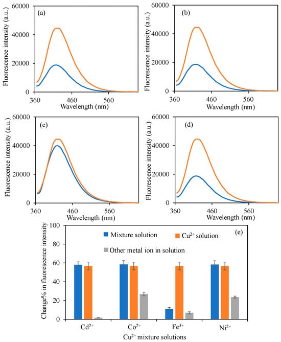 The fluorescence spectra of the B-PEI1 CDs in the presence of 2 mL 50 ppm concentrations of (a) Cu2+-Cd2+, (b) Cu2+-Co2+, (c) Cu2+-Fe3+, (d) Cu2+-Ni2+ mixture solutions, and (e) change% in fluorescence intensity of BPEI1 CDs in the presence of 2 mL 50 ppm mixture solutions. [Excitation wavelength for BPEI CDs: 360 nm; emission wavelengths: 420 nm; the volume of metal ion solutions is 2 mL, and final concentration of BPEI CDs is 0.6 mg/mL. In (a–d), orange-lined spectrum corresponds to bare BPEI1 CDs in water, blue line in the spectrum is BPEI1 CDs in mixture solutions].