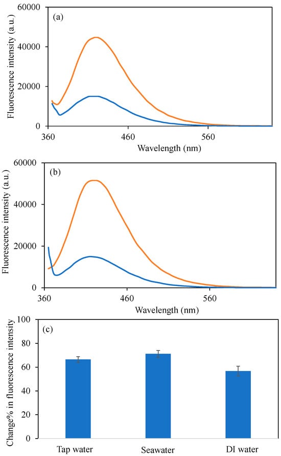 The fluorescence spectra of the B-PEI1 CDs in the presence of 2 mL 50 ppm concentrations of Cu2+ion solutions (a) in tap water, (b) in seawater, and (c) change% in fluorescence intensity of BPEI1 CDs in the presence of 2 mL 50 Cu2+ion solutions in different waters. [Excitation wavelength for BPEI CDs: 360 nm; emission wavelengths: 420 nm; the volume of metal ion solutions is 2 mL, and final concentration of BPEI CDs is 0.6 mg/mL. The blue-lined spectrum corresponds to bare BPEI1 CDs in different waters, whereas the orange line corresponds to BPEI1 CDs in Cu2+ ion contained different waters].