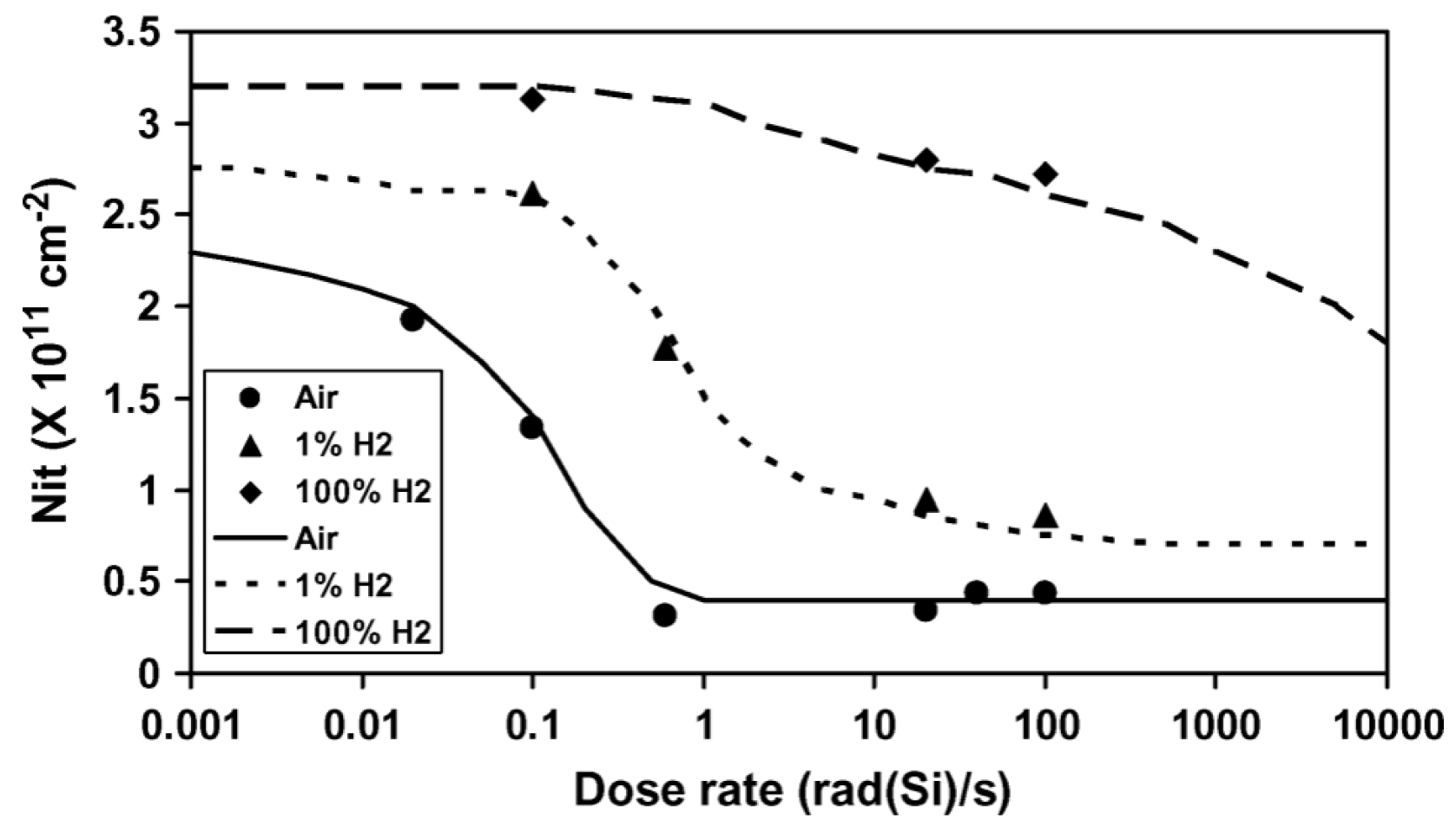 - Esqueda, I.S.; Barnaby, H.J.; Adell, P.C. Modeling the effects of hydrogen on the mechanisms of dose rate sensitivity. IEEE Trans. Nucl. Sci. 2012, 59, 701–706. [Google Scholar] [CrossRef]