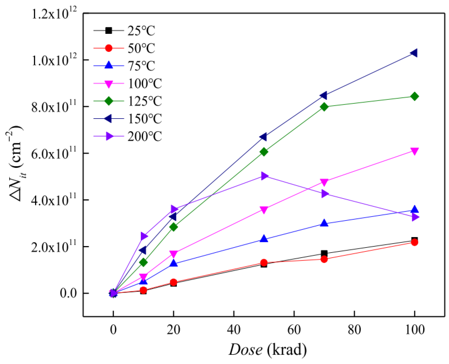 - Fleetwood, D.M. Effects of bias and temperature on interface-trap annealing in MOS and linear bipolar devices. IEEE Trans. Nucl. Sci. 2022, 69, 587–608. [Google Scholar] [CrossRef]