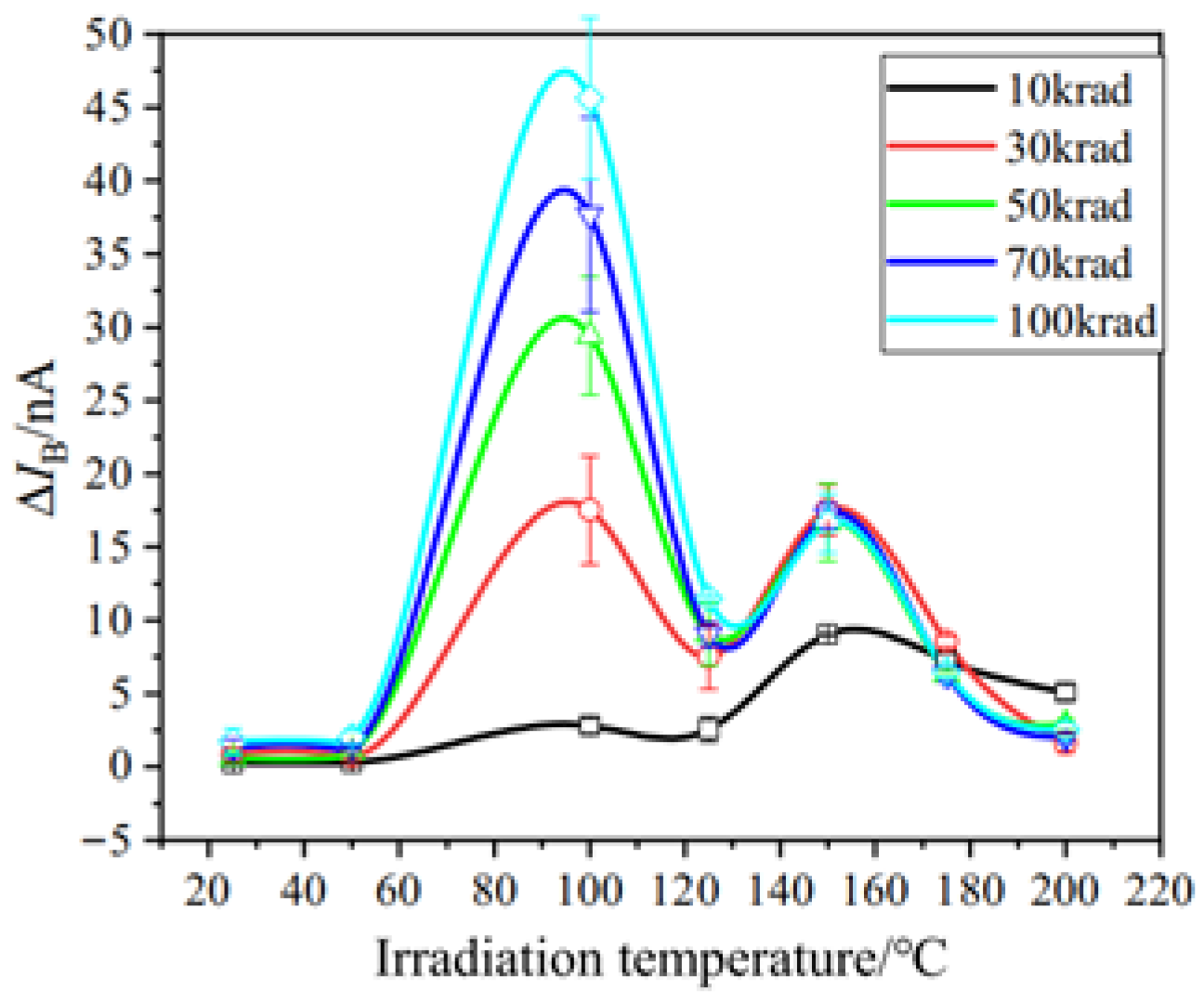 - Dong, L.; Yang, J.; Yu, X.; Lv, G.; Fan, Y.; Li, X. Evolution of ionization-induced defects in glpnp bipolar transistors at different temperatures. IEEE Trans. Nucl. Sci. 2020, 67, 2003–2008. [Google Scholar] [CrossRef]