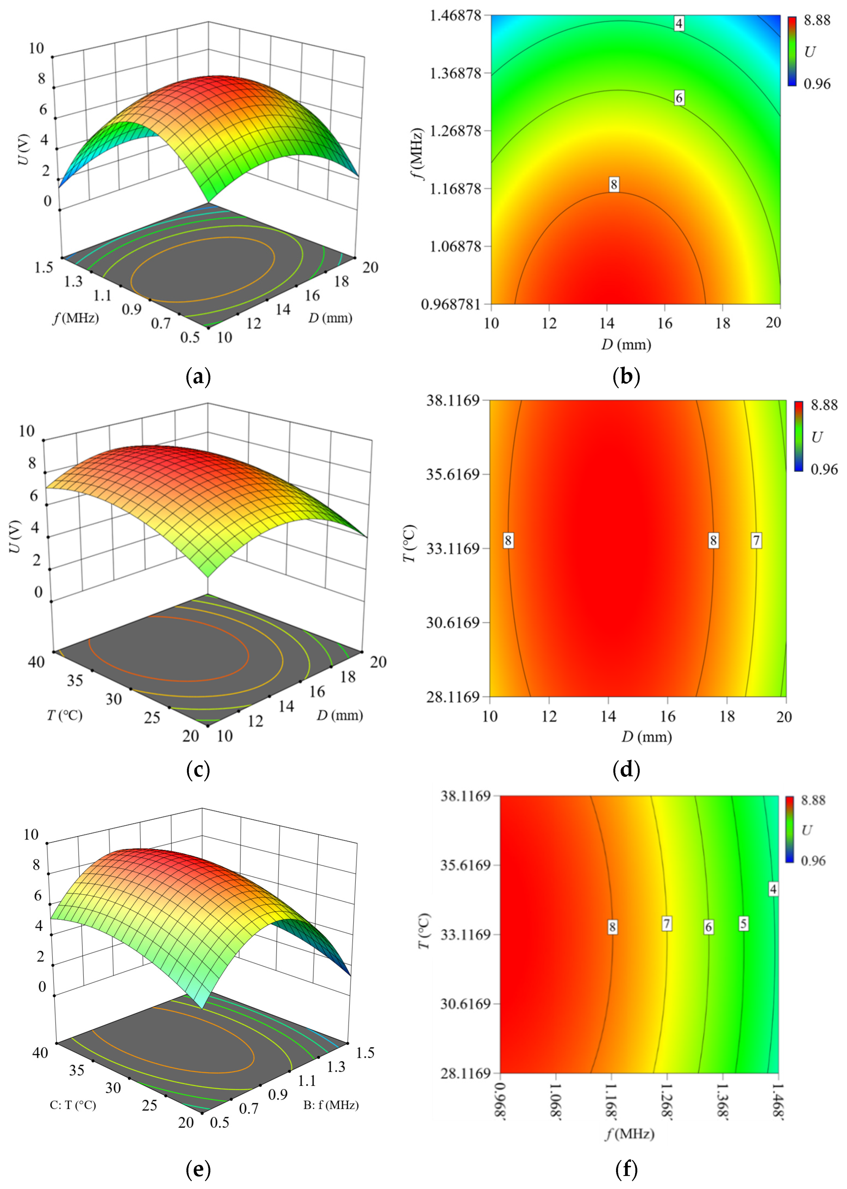 | Parameter Combination (D/mm, f/MHz, T/°C, h/cm) | Calculated Output Voltage Ucalc/V | Experimental Measured Output Voltage Uexp/V | Relative Error (%) |