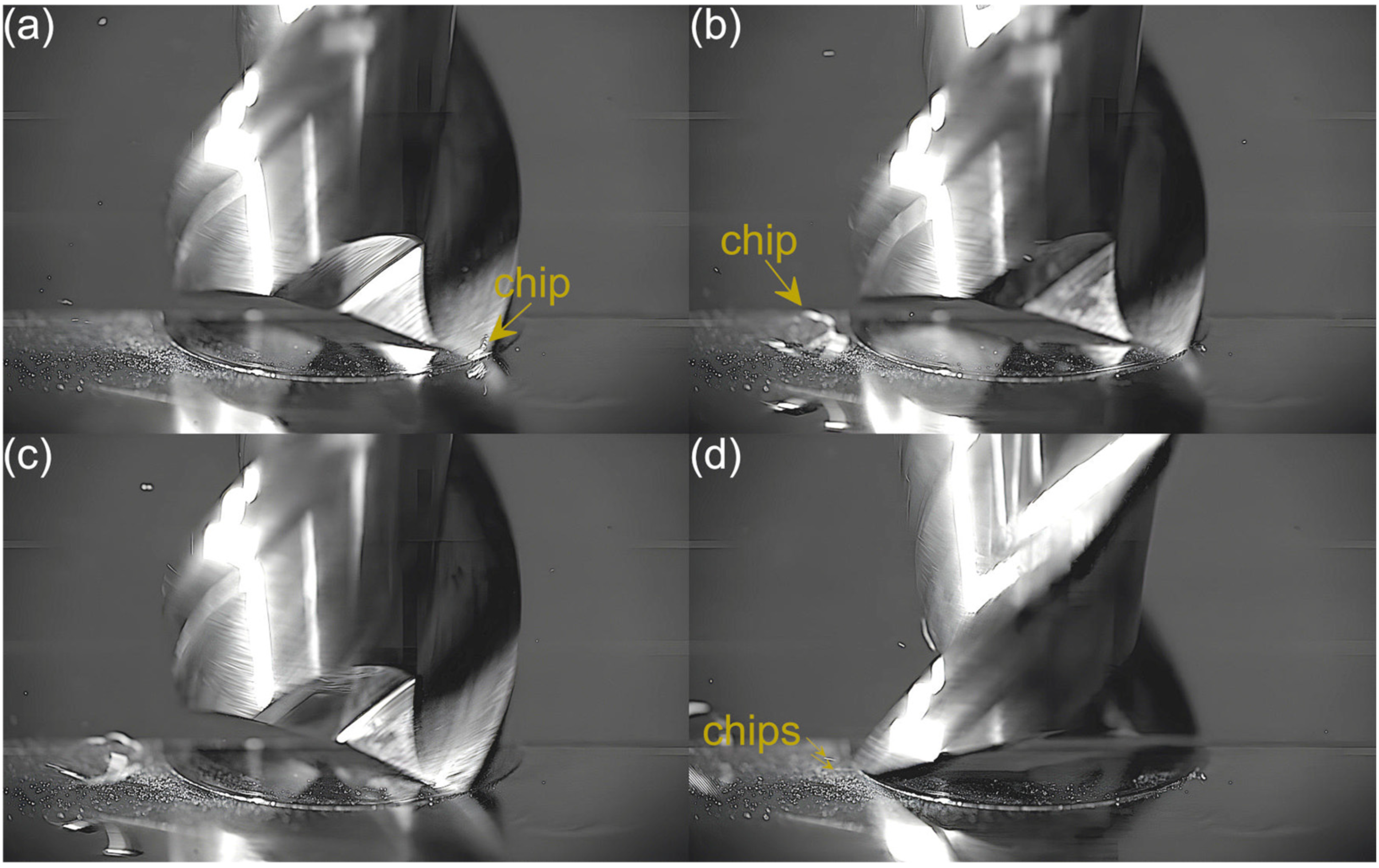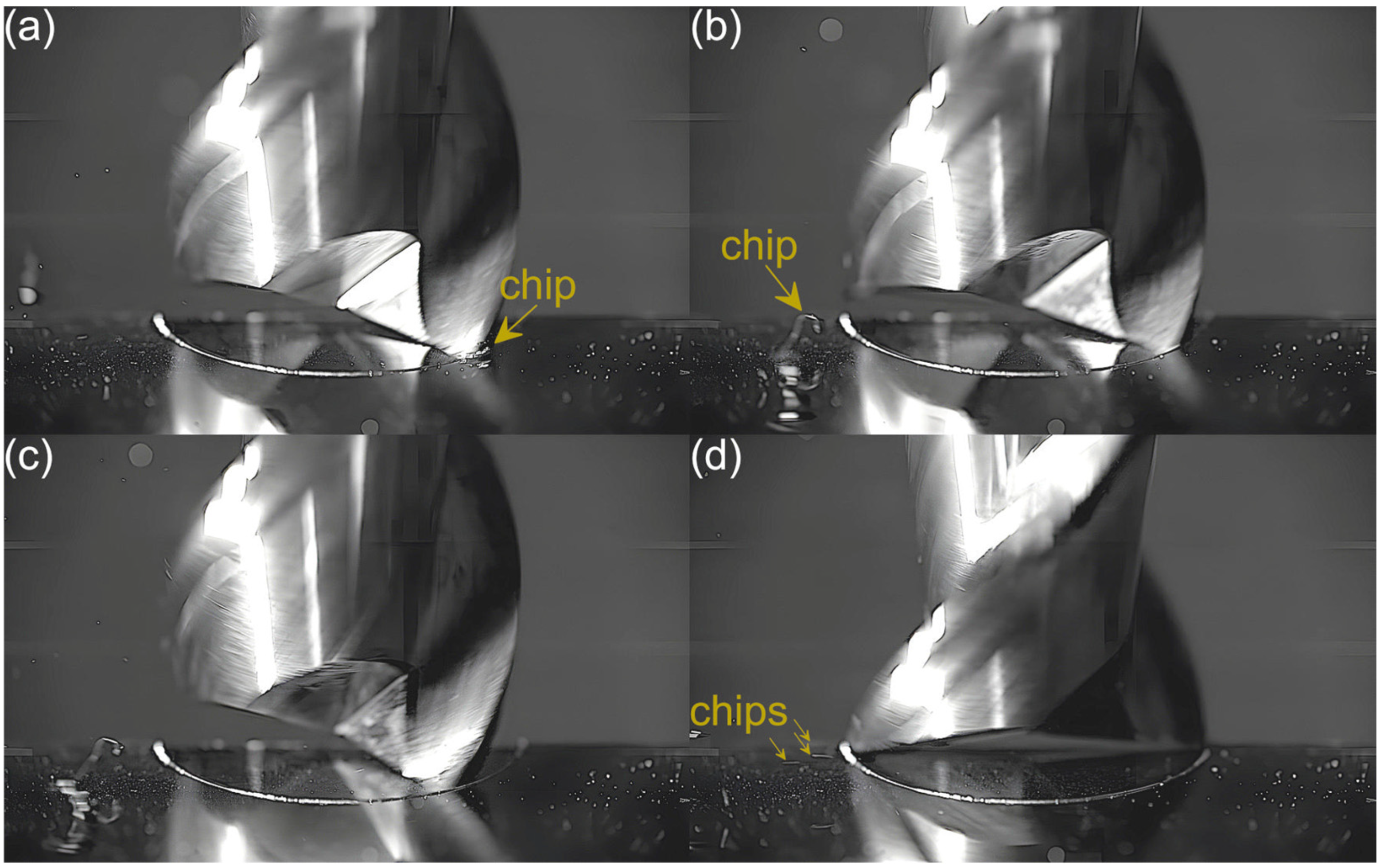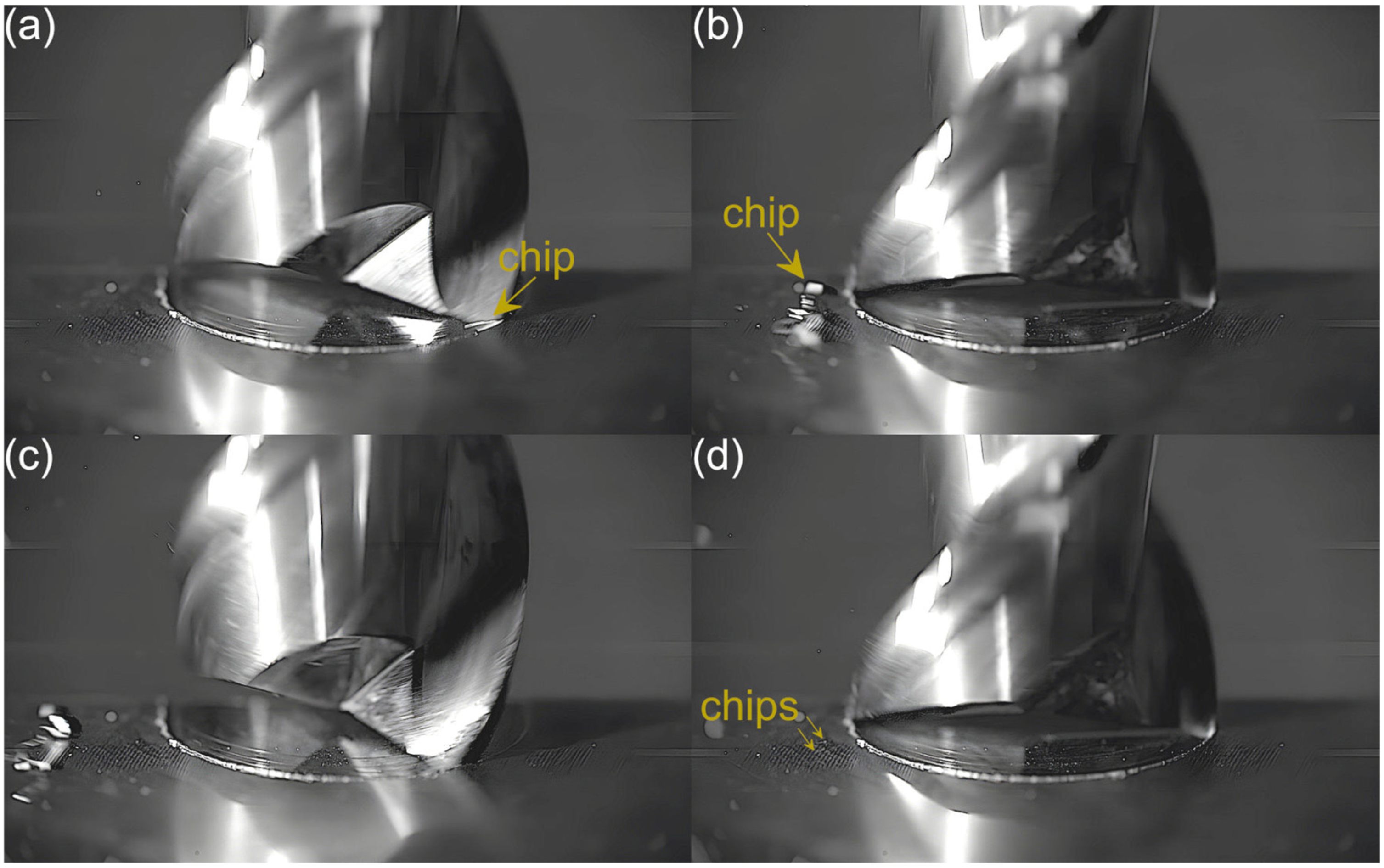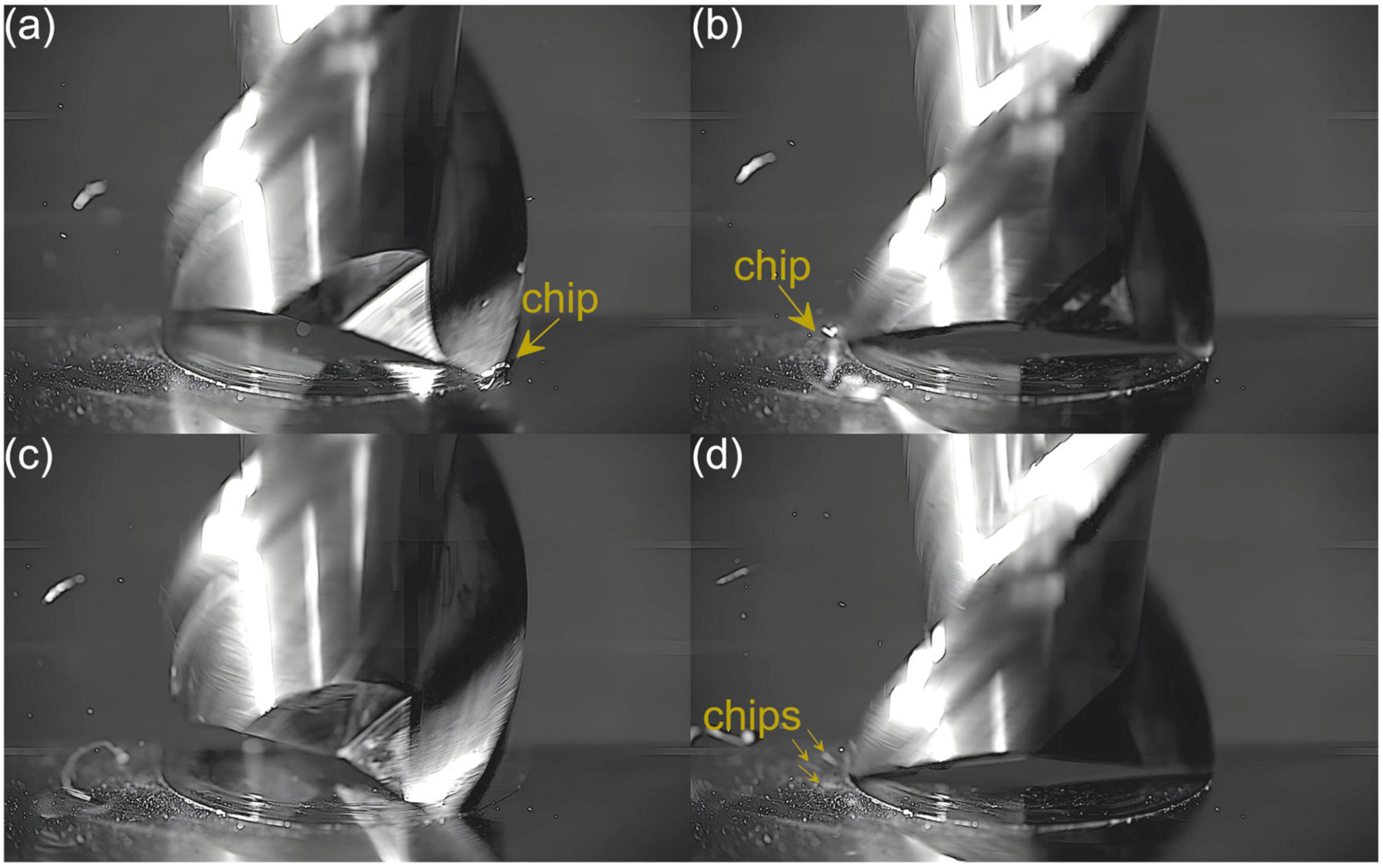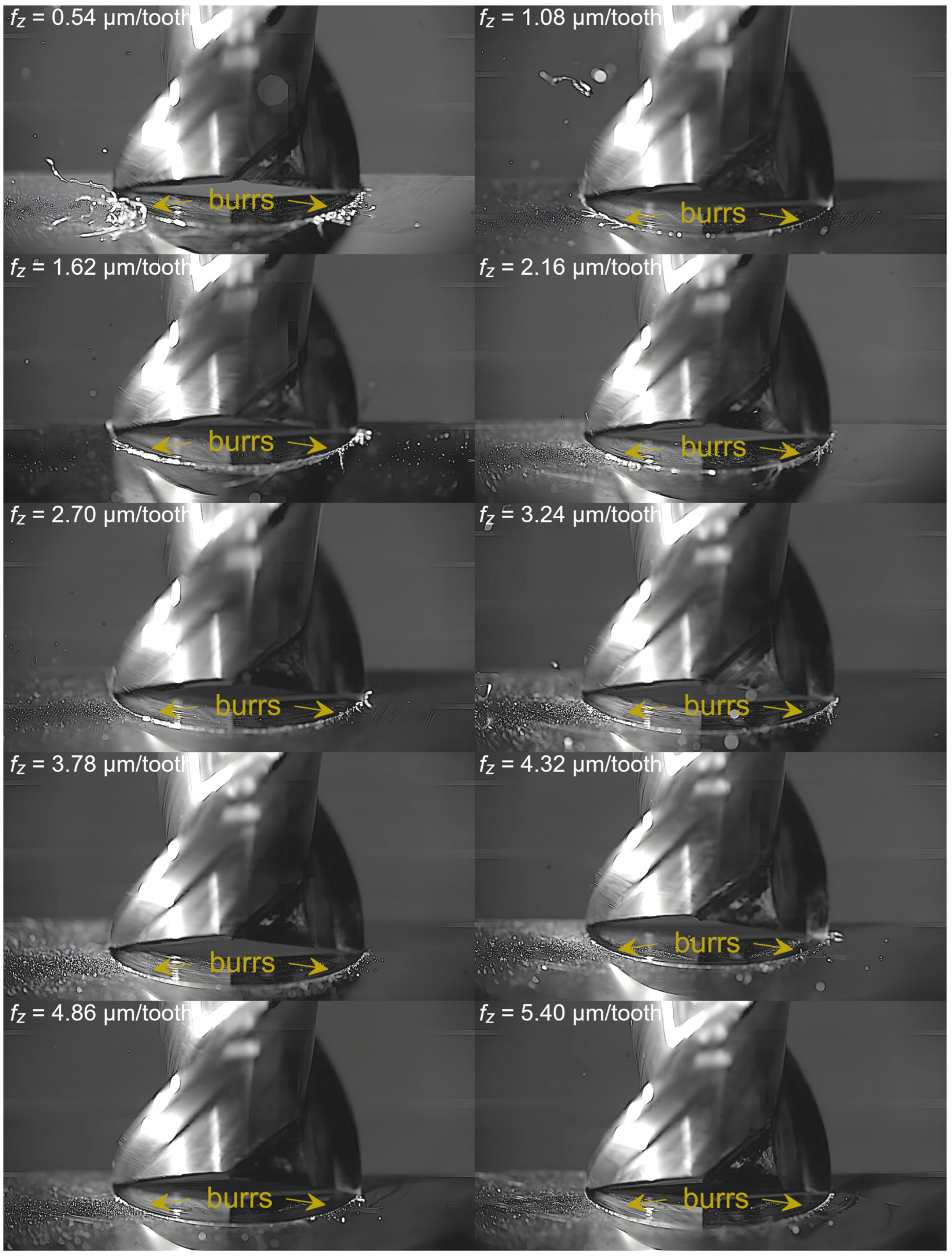 - The shearing process by the first cutting flute initiated at a feed per tooth of 0.54 µm/tooth and thus at a ratio of fz/rn = 0.1. Nevertheless, given the non-uniform performance of the cutting flutes, this value cannot be taken to be the minimum undeformed chip thickness.
