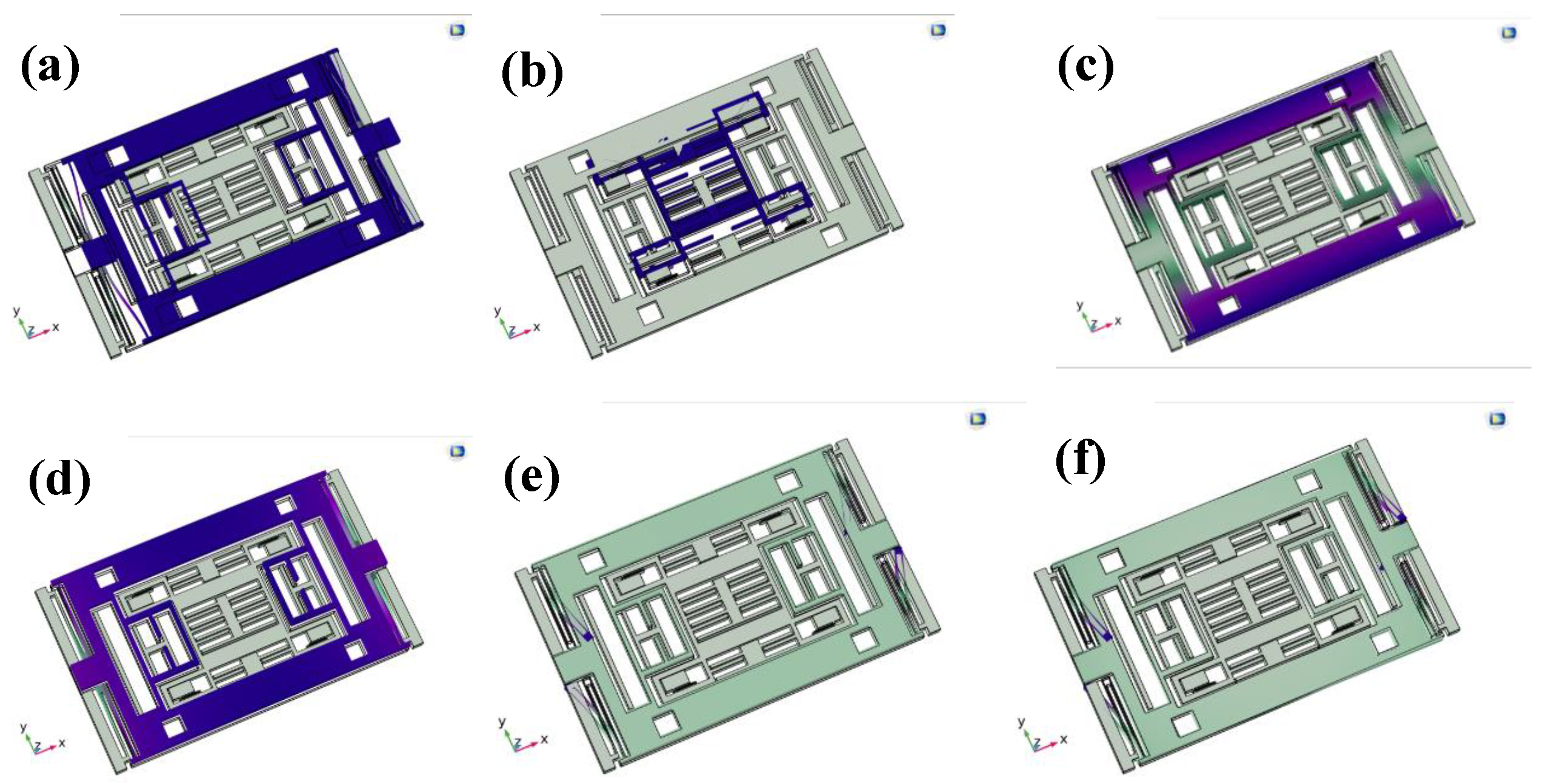 To further validate the rationality and robustness of the proposed nested biaxial accelerometer structure, a detailed finite element model was developed in COMSOL Multiphysics 6.2. To improve computational efficiency while ensuring consistency of dynamic characteristics, the comb electrodes were omitted in the simulation and equivalently modeled as additional masses attached to the frames. The material parameters used in the finite element model are as follows: for silicon, the density is 2320 Kg/m3, Poisson’s ratio is 0.27, and Young’s modulus is 169 GPa; for glass, the density is 2328.3 Kg/m3, Poisson’s ratio is 0.20, and Young’s modulus is 63 GPa. These parameters ensure that the simulation results accurately reflect the actual mechanical behavior of the device.