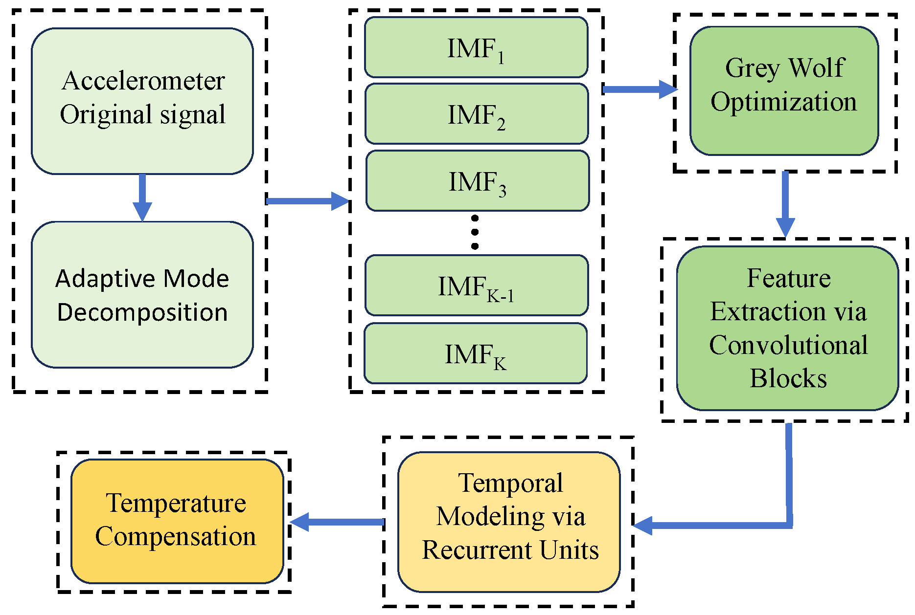 34] with a Hybrid Convolutional–Recurrent Temporal Network (HCR-TN) for temperature compensation of biaxial MEMS accelerometers. AMD-GWO employs swarm intelligence optimization to adaptively adjust decomposition parameters, ensuring effective noise suppression while retaining essential signal modes. Subsequently, HCR-TN leverages dilated temporal convolutions to extract multi-scale temporal features and incorporates recurrent units to capture long-term dependencies, enabling accurate prediction of bias and scale factor variations across two axes. The proposed method offers significant improvements in temperature compensation and accelerometer performance, providing a robust solution for MEMS accelerometers. Unlike previous methods that primarily focus on compensation for temperature drift in static conditions, our approach integrates Adaptive Mode Decomposition (AMD) and Hybrid Convolutional–Recurrent Temporal Network (HCR-TN), which enables dynamic adaptation to varying environmental conditions, further enhancing robustness and performance.