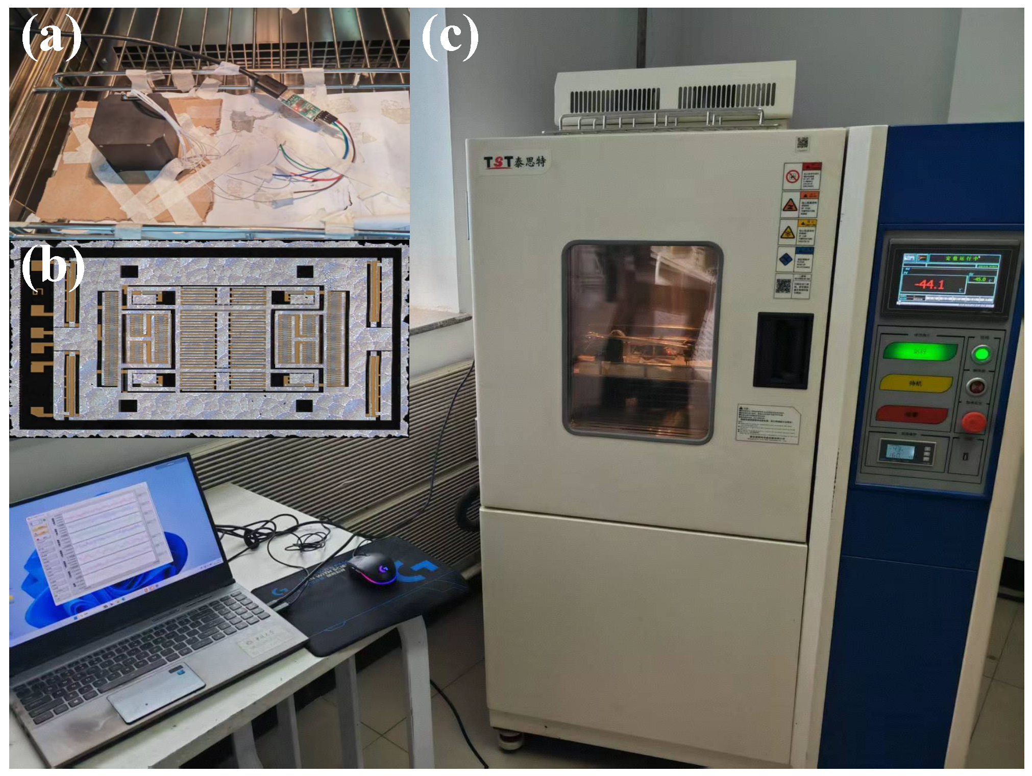 Figure 4 shows the detailed calibration setup: (a) the temperature chamber and data acquisition system used for environmental control and monitoring, (b) the physical structure of the nested dual-axis accelerometer under test, and (c) the experimental setup is illustrated.