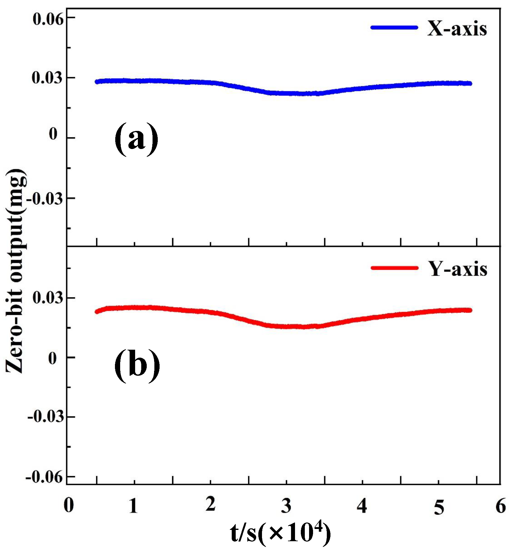 Figure 5 shows the zero-bias outputs of the dual-axis accelerometer measured in a temperature chamber experiment. The test was performed by gradually varying the chamber temperature from −40 °C to +60 °C, and recording the accelerometer output after stabilization at each set point. The output sensitivity of the X-axis and the Y-axis of the dual-axis accelerometer is 71.49 mV/g and 55.4 mV/g [