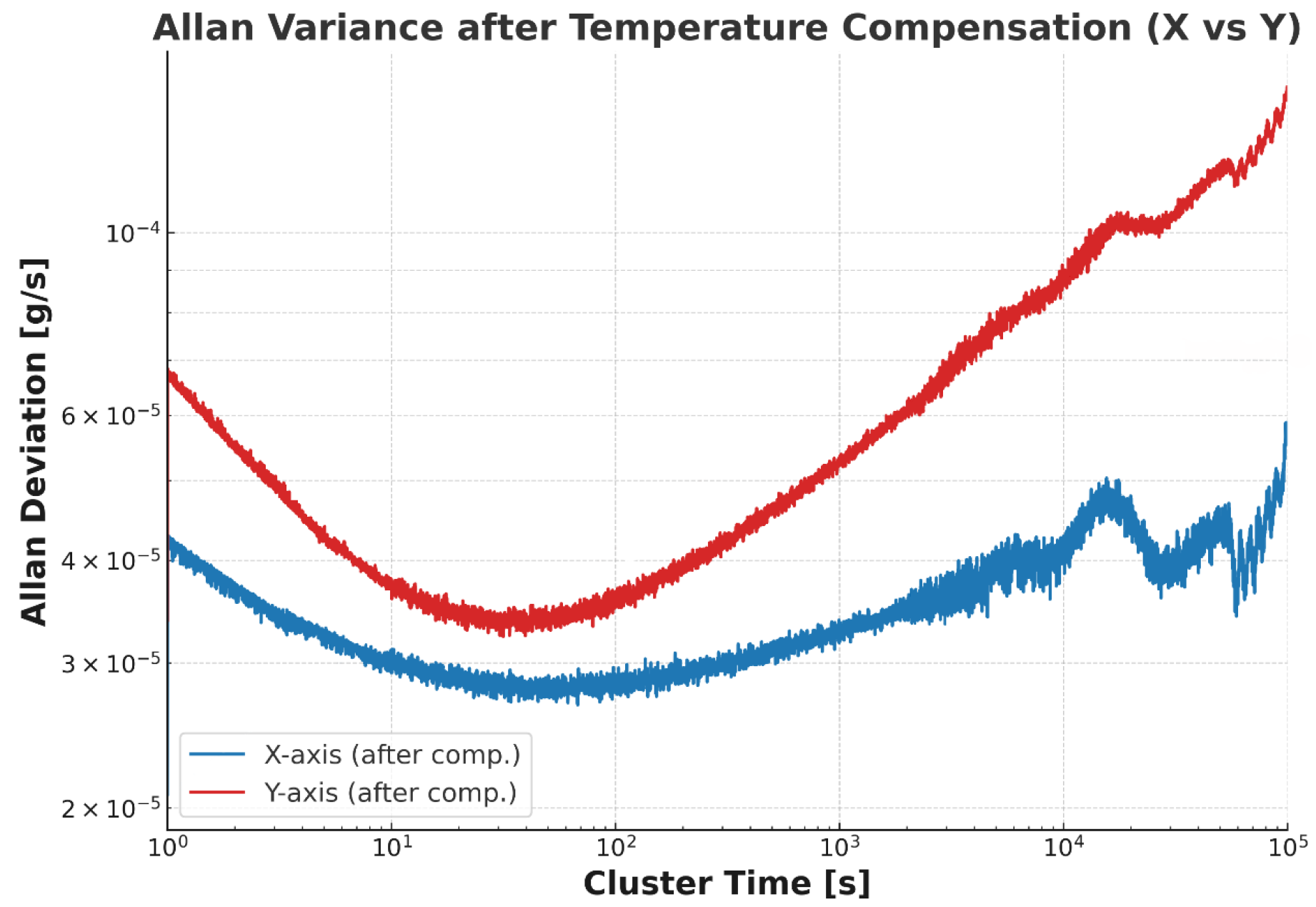 Table 1 presents the bias drift values for the temperature compensation algorithm on both the X-axis and Y-axis, along with the corresponding 95% confidence intervals (CI). These results suggest that the temperature compensation method is not only stable but also highly accurate for both axes. By including these confidence intervals, we provide a more comprehensive understanding of the algorithm’s performance, highlighting its precision and robustness in the presence of temperature variations. This uncertainty reporting offers greater clarity and confidence in the real-world applicability of the compensation algorithm.