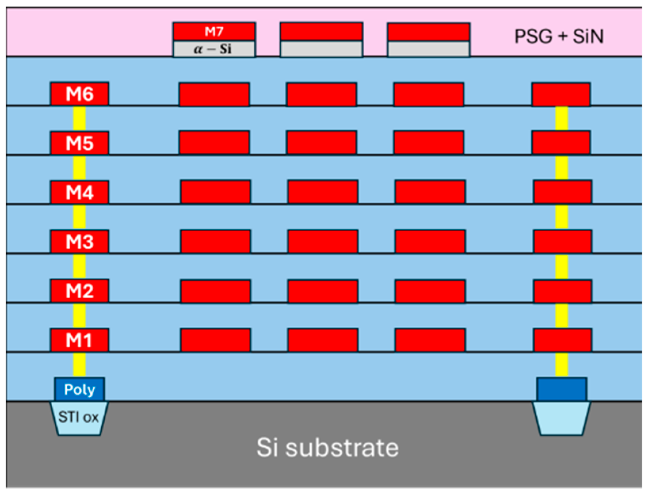 The UMC 0.18 μm CMOS MEMS process combines CMOS with MEMS on chips using 0.18 μm technology nodes. It is composed of 1 poly-silicon layer, 5 inter-layer dielectrics (ILDs), 1 passivation layer, 6 layers of tungsten vias, and 6 metal layers (M1–M6). Phosphorous silicate glass (PSG) has multiple roles in the passivation layer of CMOS devices: It acts as a getter agent, a planarizing or smoothing layer, and a chemical barrier against moisture and other contaminants [22]. Shallow trench isolation (STI) oxide is used in CMOS fabrication to electrically isolate devices, and it provides better device isolation with reduced area consumption, while also ensuring a flat surface for advanced CMOS scaling and reliable circuit performance. A metal 7 (M7) layer was further introduced to serve as a masking layer with additional patterned amorphous silicon ( α -Si) for isotropic etching. The illustration is shown in Figure 3.
