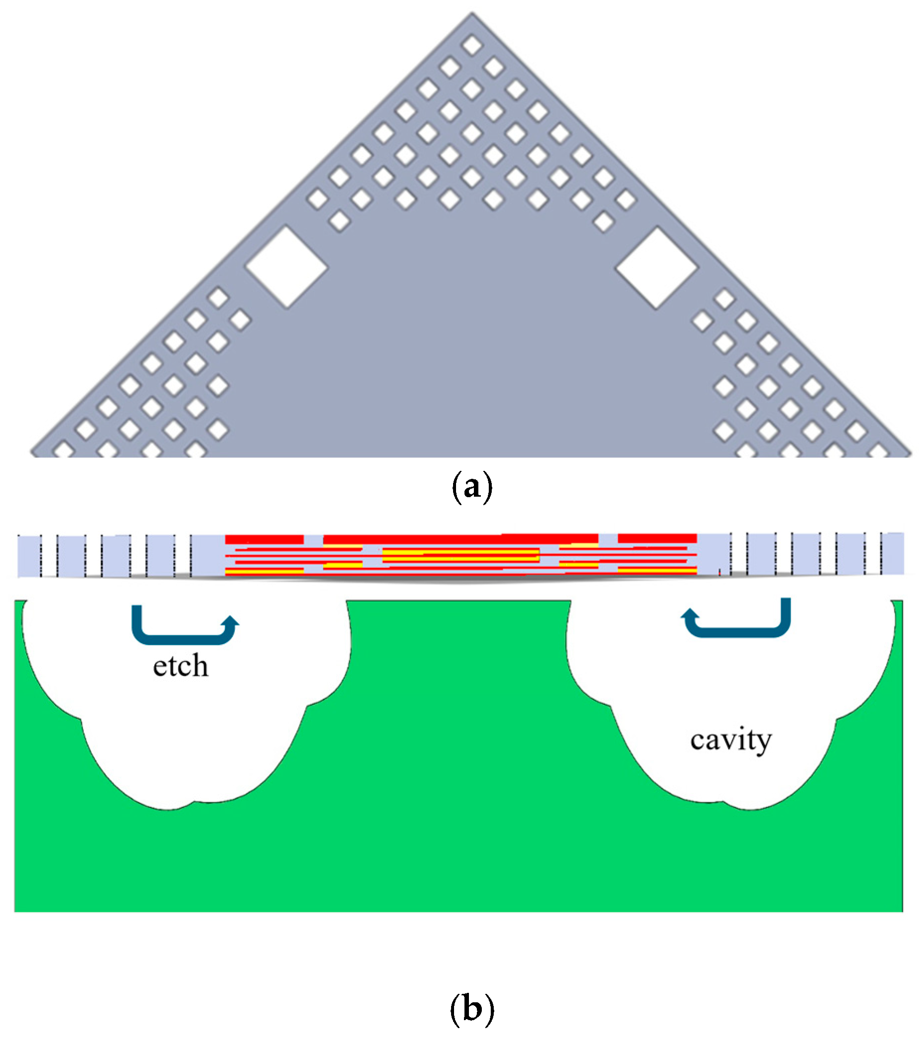 Figure 4. (a) The cross-section of the capacitive pressure sensor; (b) the capacitive pressure sensor in 3D vision with 4 larger openings (30 × 30 μm2), shown in green color.