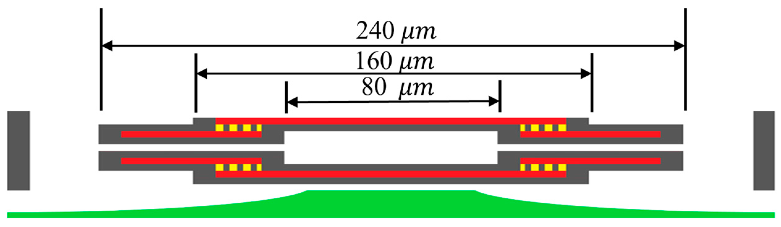 Before discussing improvements to the linearity of the pressure sensor, a double-deformable membrane configuration, or the vacuum-chamber geometry shown in Figure 2a, was preferred here to double the value of the output sensitivity of the sensor shown in Figure 1. The CMOS MEMS process makes this chamber’s fabrication easier [17].