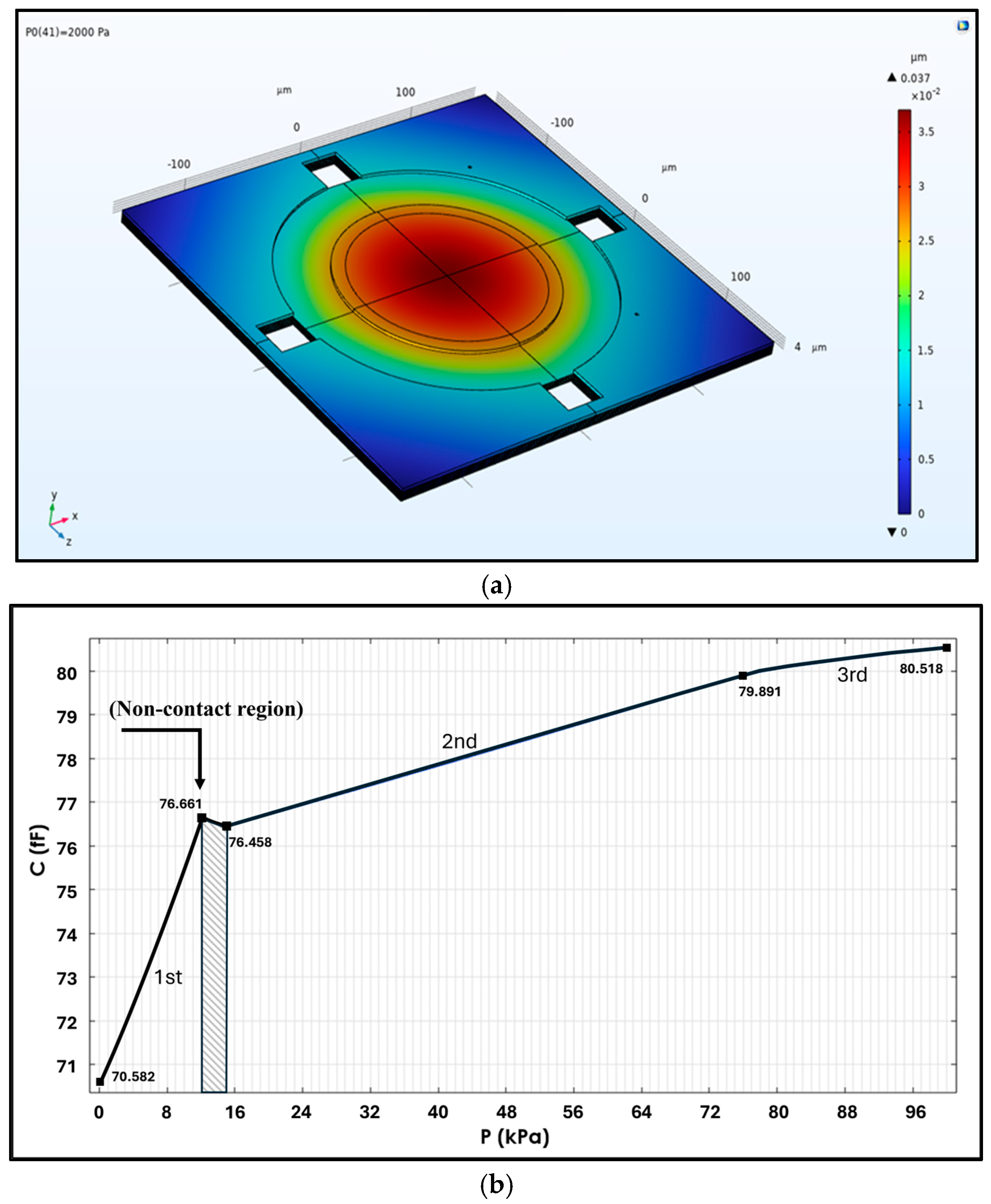 Figure 8. (a) COMSOL simulation; (b) capacitance vs. pressure of the vacuum chamber; the shadow inflection during 12–15 kPa denotes the first contact point’s inward shift.