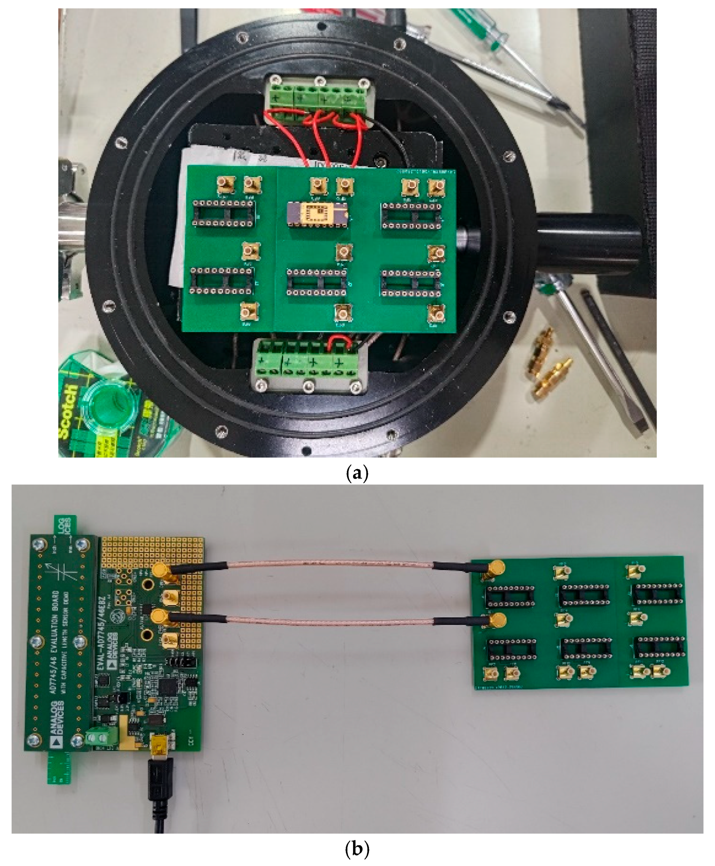 Figure 10. (a) The system of the vacuum vessel; (b) the arrangement of AD7746 with the PCB board.
