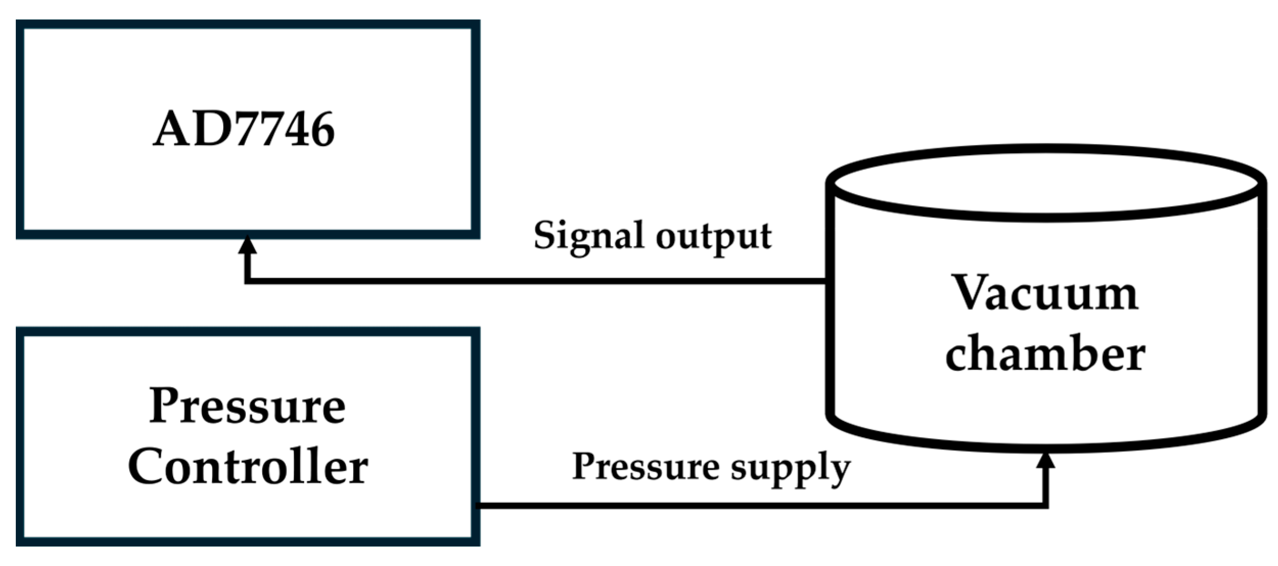 In a capacitive pressure sensor measurement, it is necessary to regulate the ambient pressure and measure variations in capacitance. Excessive reliance on a data acquisition (DAQ) system with exposed wiring in the environment introduces significant parasitic capacitance, resulting in substantial interference in capacitance measurements. Therefore, this study adopts a capacitance-to-voltage converter (CVC), AD7746, to convert capacitance signals into voltage signals. AD7746 not only outputs voltage signals in terms of the corresponding capacitance value but also minimizes parasitic capacitance. The parasitic capacitance between the pressure sensor and the AD7746 circuit can be subsequently compensated, as outlined below.
