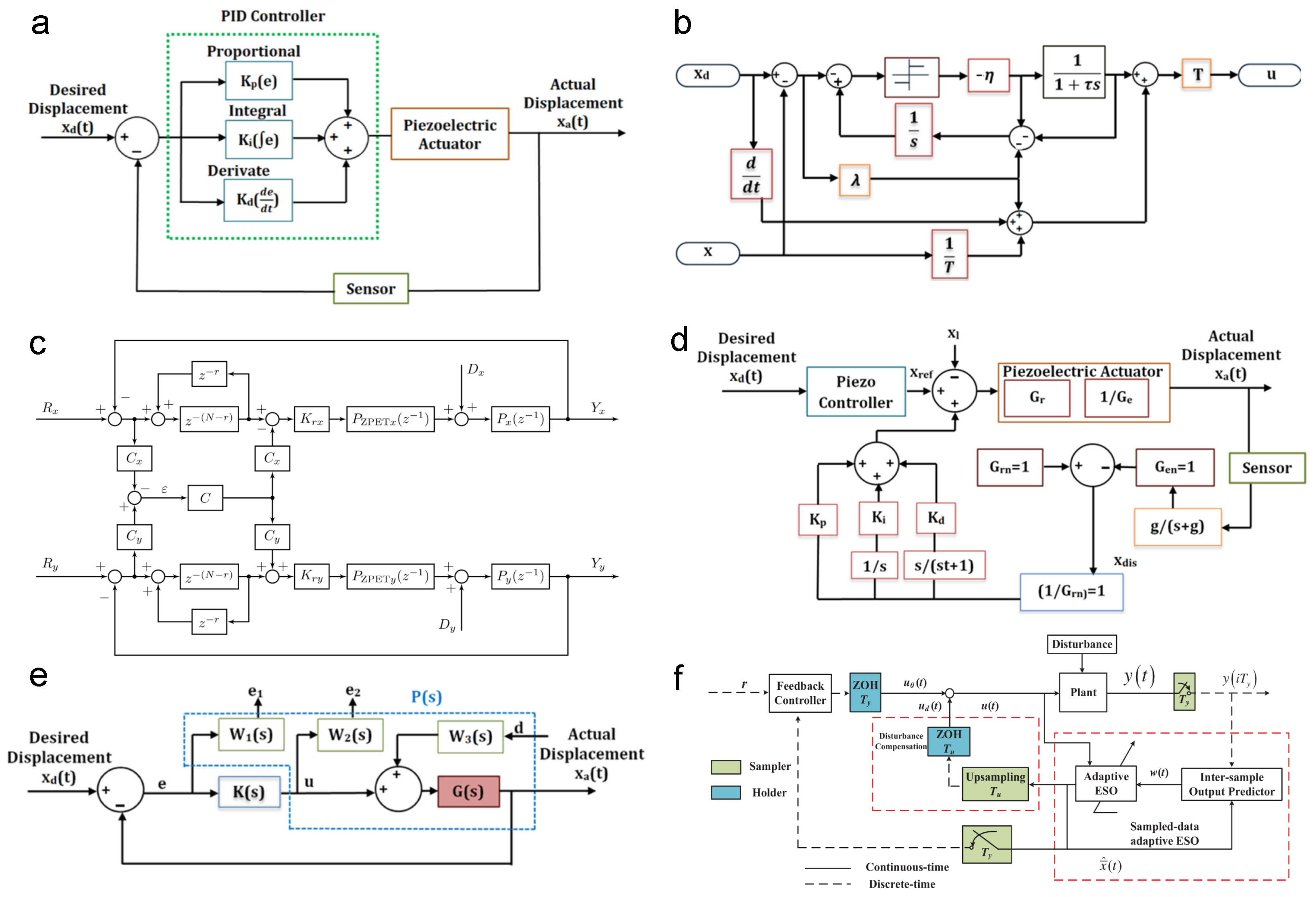 | Tracking Control | PID, Loop-Shaping (Lead-Lag, Notch), Feedforward | PID provides error-driven regulation. Loop-shaping modifies frequency response. Feedforward improves response speed and reference tracking. | Simple structure, ease of implementation, and reliable performance. Well-established design methodologies. High steady-state accuracy. | Limited capability in handling significant nonlinearities and unmodeled dynamics. Bandwidth is often limited under high-performance demands. | Point-to-point positioning and trajectory tracking for systems with well-behaved dynamics and low uncertainty. |