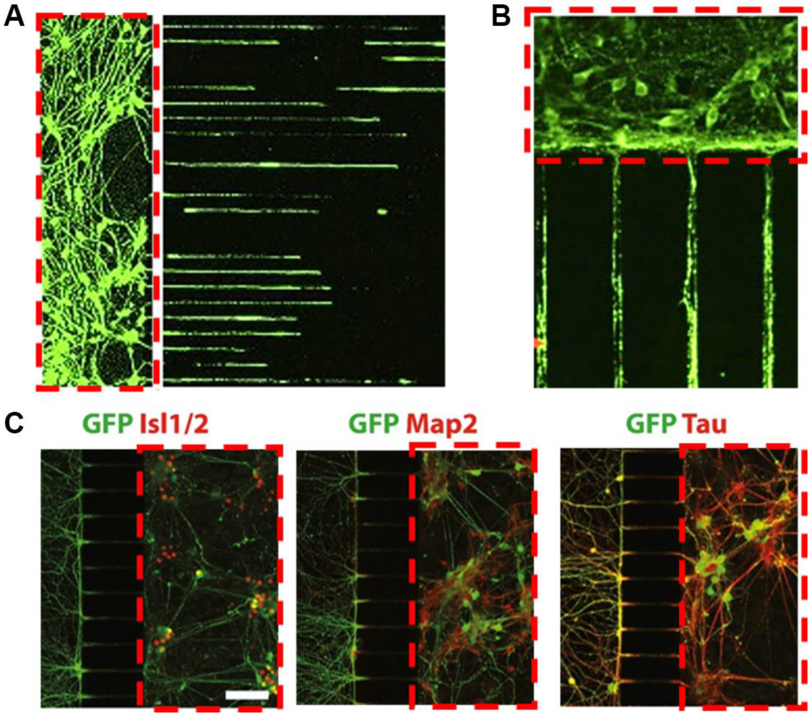 - Taylor, A.M.; Blurton-Jones, M.; Rhee, S.W.; Cribbs, D.H.; Cotman, C.W.; Jeon, N.L. A microfluidic culture platform for CNS axonal injury, regeneration and transport. Nat. Methods 2005, 2, 599–605. [Google Scholar] [CrossRef] [PubMed]