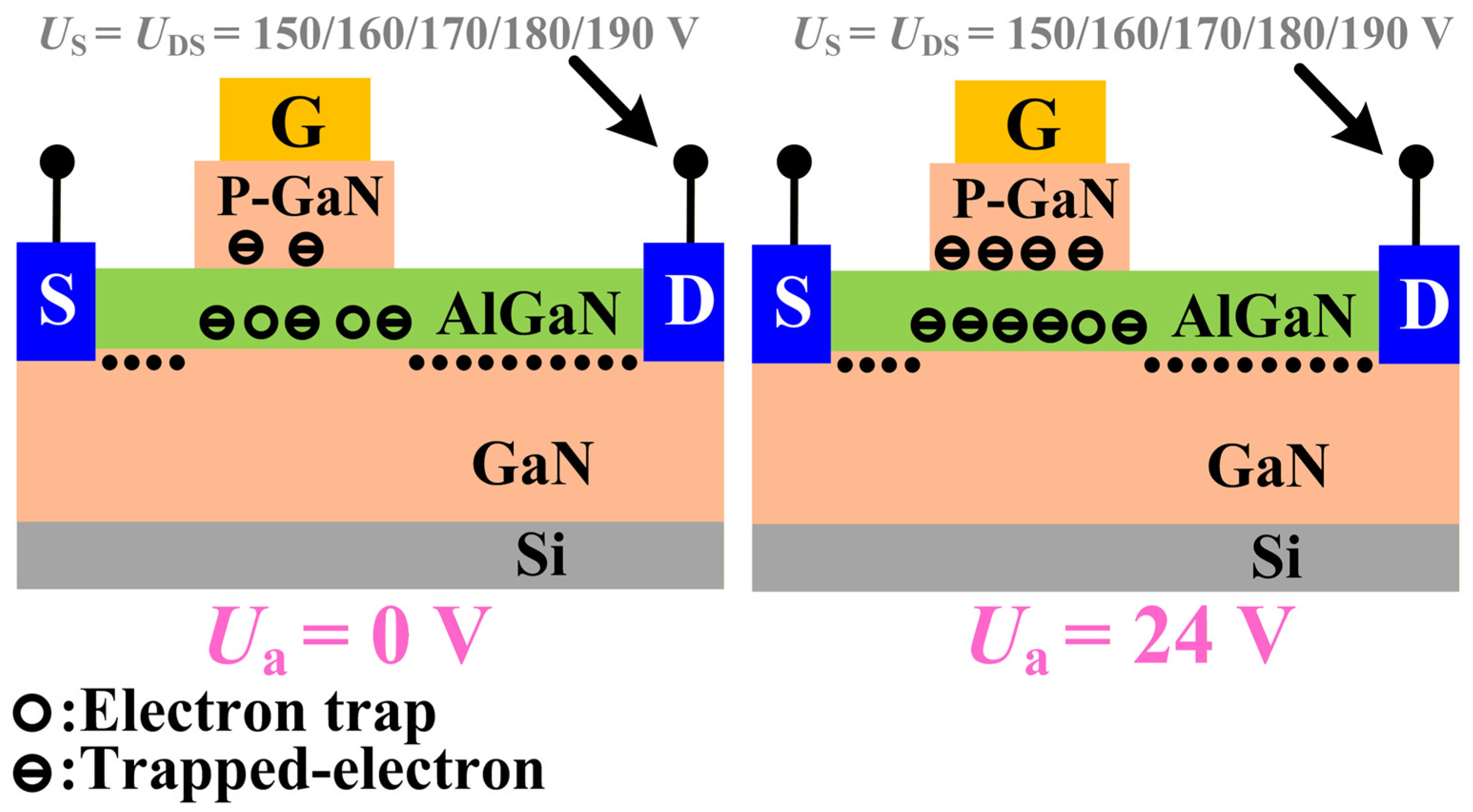 - Wen, Q.; Zhou, L.; Meng, X.; Feng, S.; Zhang, Y. Trap Location and Stress Degradation Analysis of GaN High Electron Mobility Transistors Based on the Transient Current Method. IEEE Trans. Device Mater. Reliab. 2024, 24, 624–630. [Google Scholar] [CrossRef]